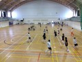 - 体育館2コートを初級者側と中級者側に分かれて練習しています。男性は中級者(経験者)側に参加できる方のみ募集、女性は初級者•中級者どちらでも募集