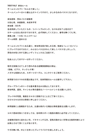 | 連絡事項や アピールポイント | 年齢高めです🤤 なので1on1ばかりでなく周りのメンバーにもパス出来る、あと女性に対してのチェックなど空気読んでもらえる方でお願いします 子連れさまも是非ご参加下さい^ ^ ※当日の参加申請は返信出来ない場合があります ⭐︎チーム規定の画像をアップしておりますので必ずご確認ください⭐︎ 毎回18人ほど集め3チームでゲームを回してます ゲストは半分が20代なのでブランクあると少しキツイかもです💦 参加費:500円 不参加になられる場合は2日前にはご連絡下さい。ドタキャンの多い方は、参加をご遠慮して頂くこともあります。 <応募時に下記内容も合わせてお願いします> 1、名前(平仮名でけっこうです) 例:まさお 2、年齢 3、性別(ご友人などお誘いの時に) 4、経験歴(高校、大学まで、現役など) 申し訳ありませんが、明らかに内容を読んでおられない方はスルーさせて頂いております。 ■youtube https://www.youtube.com/channel/UCMHVRyiAsHaRbKjWRLBDHGg https://www.instagram.com/reel/Ct8ZAyHr90t/?igshid=NjI5MGFhZTA1Yw== https://www.facebook.com/TwentyHalf ☆注意☆ 当日ビブスがありません! 濃淡(白と色付)のシャツかリバ持参でお願いします |