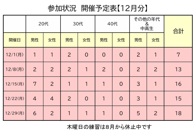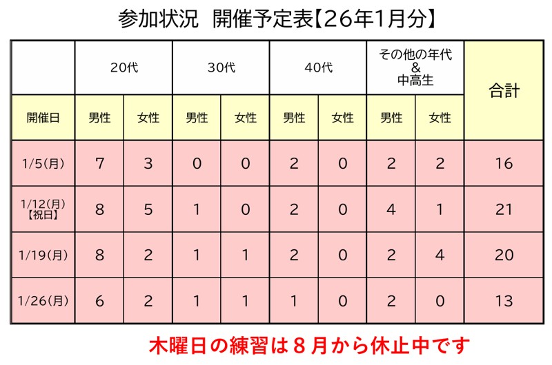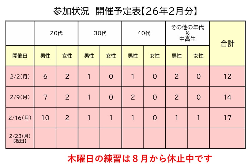 | こんな人を 探してます | 性別は不問です。最近は参加数が安定しているので新規募集はAクラス、Bクラスの募集です。 |