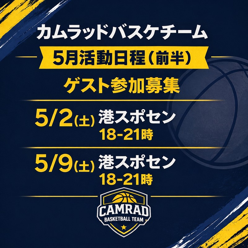 | 連絡事項や アピールポイント | メンバーが転勤や子どもが産まれた等で参加人数が少なくなってしまったため、年齢層を下げて募集再開しました。 <チーム情報> Comrade(カムラッド) レベル:ブランク有りの初中級 ・学生3年〜6年程度(社会人バスケ含めて10年程度) ・30代からブランク明けで再開など30代と40代がほとんど ・運営以外のメンバーはスポーツやろうよ。から加入頂いた方です。 (募集対象) ゲスト参加 性別:男性のみ 年齢/28歳以上(30代40代大歓迎) 経験年数/部活経験者 ※歴が長い方やレベルが高すぎる方は周りに合わせて頂いてもメンバーとのレベル差が生まれますのでお断りしております。 ※2 年齢層が高いチームなので怪我防止のため ・運営が及びプレーが危ないと判断した場合 ・モップやタイマーなどプレー以外であまりにも協力がみられない方 ・暴言や恫喝など、周りの雰囲気を壊す方 2回目以降参加をお断りする場合がございます。 サイトのミュート機能にてチームに通知が来ないようになっておりますのでご回答が出来なくなる設定になっております。 ※3 当チームは30代40代メインのチームです。 20代後半の方の参加は可能ですが 配慮とご理解のほど宜しくお願い致します。 参加費:500円/回 参加費は先にお預かりさせて頂きます。 必要な物 白と黒or紺色のリバーシブル 参加人数 ご本人含めて2名まで(身内バスケ防止のため) 活動の流れ 18:40まで自主アップ等フリー 18:50まで全員でのアップ/3対3/フリースロー 19:00 ゲーム開始 6分or7分流し 20:45 終了 ご応募について 下記の内容を記載して応募をお願い致します。 ・お名前 ・ご年齢 ・身長 ・バスケ歴 ・参加希望人数 |