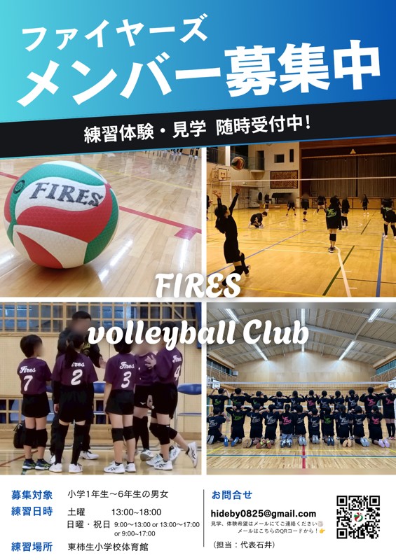 | 連絡事項や アピールポイント | 川崎市麻生区で活動している小学生バレーボールチームです。東柿生VSCが発足したのは30年前、ファイヤーズになって15年になります。 現在は岡上小学校、柿生小学校、西生田小学校、王禅寺中央小学校、菅生小学校、黒須田小学校、剣山小学校、真福寺小学校、東柿生小学校、三輪小学校の児童がメンバーです。 バレーボールって面白い! バレーボールって楽しい! 私たちのチームはバレーボールの基礎をしっかり身につけ、挨拶と礼儀やマナー、思いやりや感謝の気持ちがチームワークを作りボールが繋がり勝利を掴めるような声掛けや指導を心がけています。 クリスマス会、親子バレー等、イベントもあります!! 見学・体験、随時受付ています。 日程・時間等、相談に応じます。 動きやすい服装と上履き、水筒とタオルをお持ちください。 ご連絡お待ちしています。 ファイヤーズ 代表 石井 hideby0825@gmail.com |