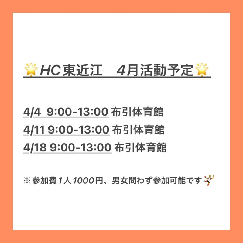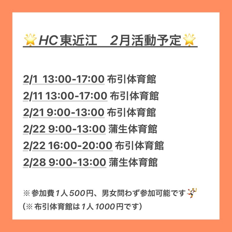 | 連絡事項や アピールポイント | 『チーム詳細』 滋賀県東近江市で活動している男女混合ハンドボールチームです。チーム結成したのは2020年8月ですが、2024年3月から新しくチームを作り直しました。毎月どちらかの土日に滋賀県にある布引体育館や蒲生体育館で紅白戦(毎回、20人程の参加者で20分ゲーム)を行っています。とにかくゆるーいチームで、主に中学や高校でハンドボールしてた方を中心に集まっています。年齢は20代、30代が多いチームです。『みんなで楽しくわいわいハンドボールする』がチームの目標なので、特に大会等の出場は考えていないです。少しでも身体を動かしたい、ストレス発散したい、ハンドボールがしたい方は是非お越しください。 ※プレーヤーも募集していますが、マネージャーも募集しています。マネージャーやってみたい方も大歓迎です。 『質問事項等』 ①見学してもよいか? A.はい、是非お越し下さい。 ②初心者なんですが入れますか? A.初心者の方も大歓迎です。 ③参加費は? A.毎回500円頂いています。 ④持ち物は何が必要ですか? A.動きやすい服装、シューズ |