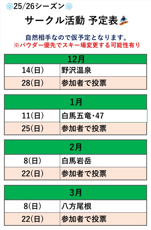 | 連絡事項や アピールポイント | スキー・スノーボードの滑り仲間を募集してます 目標:雪山を楽しむ‼️ 滑り仲間が欲しい方や、情報交換などに利用して貰えればと思っています。 別途参加費は必要ないので、道具やリフト券を準備して集合! メンバーはスノボ中上級者が多いです。 初級者の方は、ターンが出来れば参加🆗です! お試し参加🆗 1人で遠征に来る方も、日程合いそうなら連絡ください。 一緒に滑って楽しく上達しましょう❗ 🔺🔻🔺🔻🔺🔻🔺🔻🔺🔻🔺🔻 〽️25-26シーズン サークル概要〽️ サークル名の通り、ジャンル問わず滑りを楽しむことを主な目的としています。 カービングやグラトリ等、決まったことしかやってこなかった方の新たな楽しみが増えれば嬉しいです。 🔹定期開催。第2・4日曜日 🔹途中参加・途中帰宅🆗 身体と相談して、無理はしないようお願いします。 ♦️活動日♦️ ※仮予定なので、スキー場変更する場合があります。ご了承下さいませ。 《12月》 14日 野沢温泉 28日 参加者で投票(場所未定) 《1月》 11日 白馬五竜&47 25日 参加者で投票(場所未定) 《2月》 8日 白馬岩岳 22日 参加者で投票(場所未定) 《3月》 8日 八方尾根 22日 参加者で投票(場所未定) ▲私自身は基本的に土日滑っているので、お気軽にお問い合わせください! 🔽代表者プロフ 男30歳 長野県在住 スノーボード歴10年以上 HAKUBAバレーシーズン券 スタイル:カービング・フリーライティング yukiyama ID:OxbNkynN0Bm |