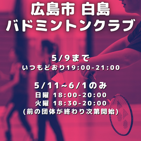 | 連絡事項や アピールポイント | 広島市のみなさん、#バドミントン しませんか?区外でも大丈夫💪🔥ダブルスの試合のルールがわかり、基礎打ちまではできるというレベル以上。予約や連絡不要。とにかくまずはお越しください。(個別のメッセージ返信ほとんどできませんので最新情報はinstagramなど見てから来てください) 【火曜日・日曜日 19:00~21:00 白島小学校体育館】 料金は1回500円。用具の貸出はございません。アップや基礎打ちを行ったあとはランダムにペアを組み #ダブルス の試合をどんどんやっています。 ★ダブルスの試合のルールがわかる(自発的に試合中のスコアも数えて下さいね) ★基礎打ちができるレベル以上 ★予約・連絡不要。直接お越しください。(返信等できません) ★自転車・バイク置き場あり。自動車も駐車可能。正門からお入りくださいね。 👉最新情報・スケジュール確認はこちらから ■Facebook https://www.facebook.com/hakushimabadminton ■Instagram https://www.instagram.com/hakushimabadminton/ 👉以下に該当する方はお断りいたします ・37.5度以上の発熱、咳などの症状がある方 ・ご家族やお勤め先、学校など、ご自身の身近に新型コロナウイルス感染症に感染した方、またはその可能性のある方がいらっしゃる方 ・上記に限らず、体調の優れない方 ・入管法に基づく入国制限の対象となっている地域から日本への入国後14日間経過していない方 |