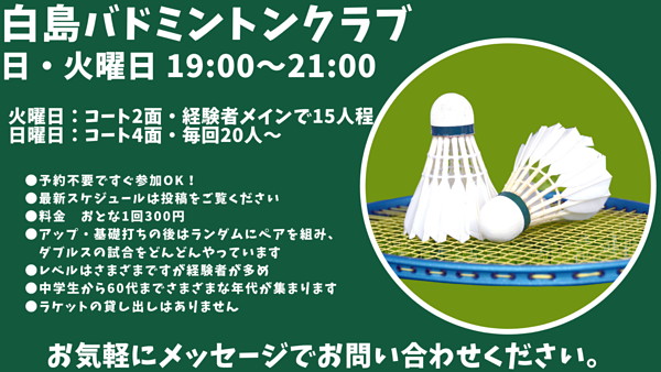 | サークル ホームページ | https://www.facebook.com/hakushimabadminton |