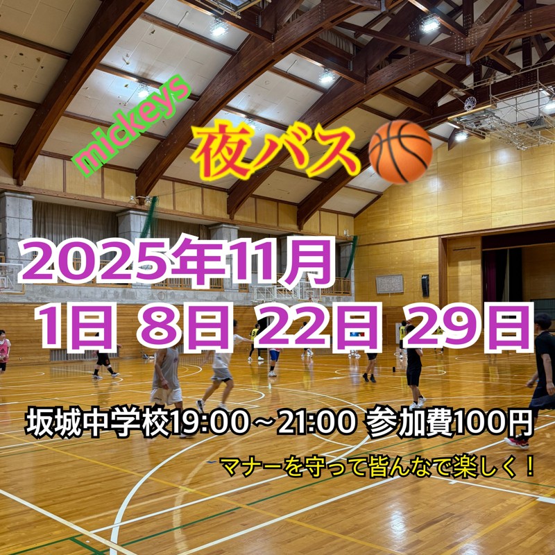 | 連絡事項や アピールポイント | 活動予定 2025年10月 全休 2025年11月 1日 8日 22日 29日 それ以降の予定は決まり次第掲載します。 坂城中学校で活動してる土曜の夜バス 「ミッキーズ」は、一緒にバスケを楽しめる方を歓迎します! 皆んなで楽しくがモットーなので、感情的になる人や自己中プレイヤー、激しいプレイや誹謗中傷をする人はご遠慮下さい。 集まった人達でチームを組み、5対5のゲームを楽しんでます。年齢層は20代が多いですが、40代、50代、中学生や高校生も参加してます。 参加費として1人100円をお願いしています。 クラブチームではないので、都合の良い日に気軽に参加して下さい。初心者やブランクある人もバッシュ片手に遊びに来て下さい。 女性や未経験者も多く参加しており、ゆるく楽しくバスケしています。 通知の遅延等でメッセージの返信が遅くなる時があります。その際はInstagramやLINEで #坂城夜バス を検索し、ご連絡下さい。 https://instagram.com/mickeys_basketball |