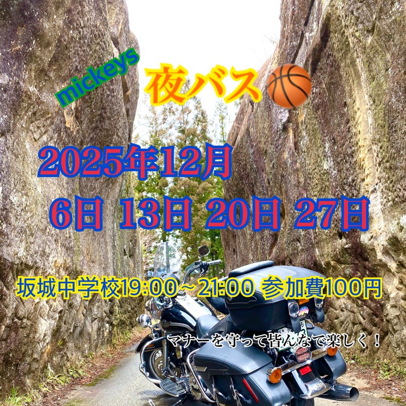 | 連絡事項や アピールポイント | 活動予定 2025年12月 6日 13日 20日 27日 それ以降の予定は決まり次第掲載します。 坂城中学校で活動してる土曜の夜バス 「ミッキーズ」は、一緒にバスケを楽しめる方を歓迎します! 皆んなで楽しくがモットーなので、感情的になる人や自己中プレイヤー、激しいプレイや誹謗中傷をする人はご遠慮下さい。 集まった人達でチームを組み、5対5のゲームを楽しんでます。年齢層は20代が多いですが、40代、50代、中学生や高校生も参加してます。 参加費として1人100円をお願いしています。 クラブチームではないので、都合の良い日に気軽に参加して下さい。初心者やブランクある人もバッシュ片手に遊びに来て下さい。 女性や未経験者も多く参加しており、ゆるく楽しくバスケしています。 通知の遅延等でメッセージの返信が遅くなる時があります。その際はInstagramやLINEで #坂城夜バス を検索し、ご連絡下さい。 https://instagram.com/mickeys_basketball |