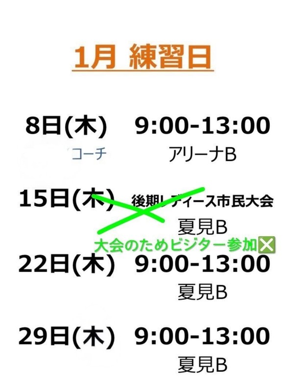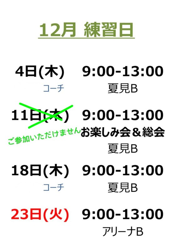 | 連絡事項や アピールポイント | 仕事、子育て、生活のリフレッシュに 楽しく打ちませんか(*´-`) 健康維持から時には本気で♪ 月に2度コーチを招き、 市や県主催の様々な大会に 出場しています。 ーーーーーーーーーー ☆部費1ヶ月 2,500円 ☆お試し参加 1回 800円 (コーチ日のお試し参加は 経験者のみ可 1,000円) ※練習日は画像をご確認下さい ※部の都合により ご参加いただけない事もあります。 ーーーーーーーーーー まずはお気軽に♪ お問い合わせお待ちしております🏸 ( ´ ▽ ` )ノ |