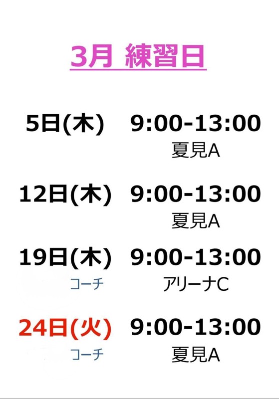 | 連絡事項や アピールポイント | 何か新しいこと始めたい! そんな新年度スタートの時期 仕事、子育て、生活のリフレッシュに 楽しく打ちませんか(*´-`) 健康維持から時には本気で♪ 月に2度コーチを招き 市や県主催の様々な大会に 出場しています。 ーーーーーーーーーー ☆部費1ヶ月 2,500円 ☆お試し参加 1回 800円 (コーチ日のお試し参加は 経験者のみ可 1,000円) ※練習日は画像をご確認下さい ※部の都合により ご参加いただけない事もあります。 ーーーーーーーーーー まずはお気軽に♪ お問い合わせお待ちしております🏸 ( ´ ▽ ` )ノ |