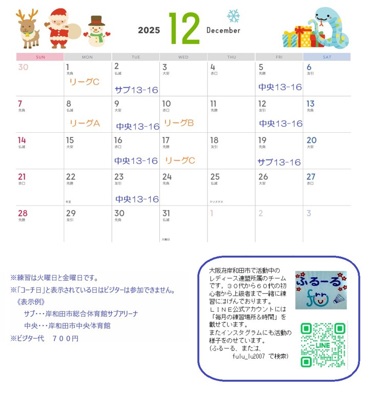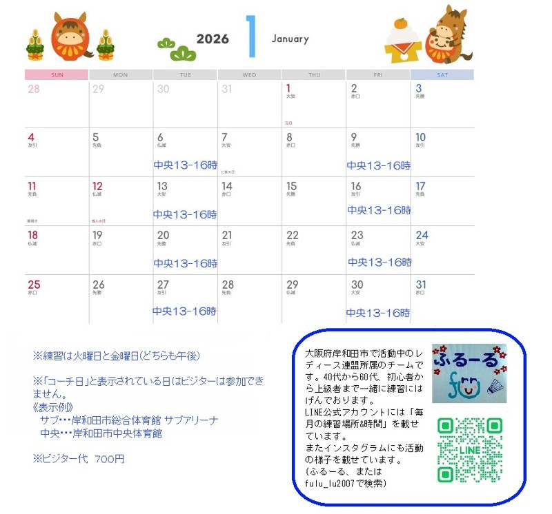 | 連絡事項や アピールポイント | こんにちは。ふるーるです。 大阪府岸和田市で活動している女性チームです。 現在は下は40代から上は60代まで、一緒に練習にはげんでおります。 初心者から上級者までレベルは様々です。 (初心者の方も基礎から教えますので、安心してください。) ※練習時間 毎週火曜、金曜 13時から16時 岸和田中央体育館 〈コーチ日&体育館の状況によって変更の場合あり〉 ※参加費 体育館代とシャトル代合わせて700円です。 〈値段変更の場合あり〉 ※チーム目標及び練習内容 大阪府のレディース連盟に登録しているチームです。 リーグ戦には現在3チームで参加し、毎回昇部することを目標にしています。 週2回の練習では、基礎から実践、弱点克服のためのパターン練習に皆熱心に取り組んでいます。 練習場所を探している方もやった事はないけどバドミントンに興味がある方も、一度体育館をのぞきに来てください。楽しくバドミントンしましょう! ☆LINE公式アカウントには、「毎月の練習場所&時間」を載せています。 上記QRコードを読み取り、友達追加してください。 また問い合わせ等、LINE公式アカウントからでもOKです。 ☆インスタグラムでは活動の様子を載せています。 fulu_lu2007 で検索 よろしくお願いします。 |