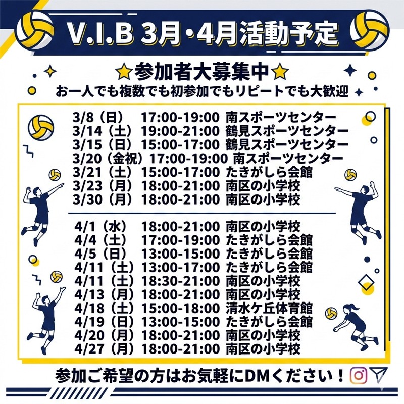 | 連絡事項や アピールポイント | 仕事終わりや休日に大好きなバレーボールを思う存分に楽しみたいという方へ。 わたしたちは横浜市南区で約5年続いているバレーボールチームです。現在登録メンバーは46名、昨年は年間75回活動しました。 月曜日は京急線の急行停車駅から徒歩5分の小学校が基本活動場所なので、アクセスがよく通いやすいかと思います。 土日は抽選の結果次第ですが、たきがしら会館、神奈川、磯子、港南、南、西スポーツセンターを重点に活動してます。 ※3〜4月は添付画像かインスタの活動予定表を参照ください! 所属年齢は20歳〜38歳、元プロ選手や春高出場経験のある上手い人からバレーボール部ではなかった私のような素人まで幅広い層で構成されています。 (現在は未経験者の募集は停止しております) ほんとたまにだけ来る人、月曜日固定で来る人、皆勤賞はいませんがほぼ毎回参加してる人など各々自由に楽しんでいただいてます。 ⭕️久々にバレーするので上手くできるか心配 ⭕️周りが上手すぎて足を引っ張ったらどうしよう ⭕️アウェーな感じだったらやだな ⭕️お試しでとりあえず参加したいけどいいのかな このような心配事もあるかと思いますが心配一切ご無用です!! おかげさまでご参加いただいた方からは楽しかった!とのお声を多くいただいてます。 ✖️少しでも下手な人がいると楽しめない ✖️12名以上じゃないと参加したくない ✖️自己中心的な方 ✖️協調性のない方 このような方にはご遠慮いただいてます。 本当に不思議なのですが、日によって参加人数、男女割合、レベルが大きく異なります。 12名集まらない日もあれば、3チームになったりもします。 今日みんな上手すぎるという日もあれば、ちょっと物足りないかもという日もあります。 このような事情含めバレーボールを楽しみたいという方、ご連絡お待ちしてます! ※最近は男性参加者の割合が多く、女性参加者が少なめです。もし女性人数が少ないと心配、こわいなという方はメッセージいただけたらその日の参加人数詳細をお伝えしますのでお気軽にお申し付けください。 ※月曜は比較的安定して12〜15名集まってますが、土日は参加人数、メンバーが不安定です。 ⭐️⭐️予定⭐️⭐️ 3/30(月)18:00-21:00 南区の小学校 4/1(水)18:00-21:00 南区の小学校 4/4(土)17:00-19:00 たきがしら会館 4/5(日)13:00-15:00 たきがしら会館 4/11(土)13:00-17:00 たきがしら会館 4/11(土)18:30-21:00 南区の小学校 4/13(月)18:00-21:00 南区の小学校 4/18(土)15:00-18:00 清水ケ丘体育館 4/19(日)13:00-15:00 たきがしら会館 4/20(月)18:00-21:00 南区の小学校 4/27(月)18:00-21:00 南区の小学校 【募集要項】 ♥バレーボール経験3年以上(あくまで目安です) ♥全員で繋ぐ楽しいバレーができる人 ♥20歳〜37歳位まで ※以前ご参加いただいた方大歓迎です。 ※ブランクがある方も大歓迎です。 ※未成年の方はご遠慮いただいてます 【活動について】 6人制バレーボール(男女混合) 参加費:300円 ウォーミングアップ→100回チャレンジ→ゲーム→アタック練習→ゲーム→自由時間→ゲームゲームゲームといったスケジュール感です。 活動時間に間に合わなくても途中帰宅も全然OKです。 【メッセージについて】 インスタのDMまたは、スポーツやろうよ!のメッセージでご連絡をお待ちしております。 👇👇のように送ってください! [氏名]:ニックネーム可 [年齢]:◯◯歳 [バレー歴]:中学3年間等 [参加希望日]:◯月◯日◯時〜 [フリートーク]:バレーサークル探してます。等 【その他】 自由なスケジュールでご参加ください!かけもちOKです!(人数を把握するため、必ず事前にご連絡ください) 少しでも興味のある方ご連絡ください。お子様連れも大歓迎です。一人でも複数人での参加もOKです。 【注意事項】 ※インスタに画像や動画をあげさせていただきます。顔がはっきり写らないようにしてますが、NG画像や動画がありましたら、メッセージにて教えてください!🙇 ※メンバー間での宗教の勧誘や他サークルへの勧誘目的、商品販売等は一切禁止しております。 見つけ次第、強制退会、出入り禁止とさせていただきます。 ※誠に勝手ながら主催者側がスポーツ以外の目的で参加していると判断した場合、秩序を乱すと判断した場合や、無断キャンセルする方は出入り禁止とさせていただきます。 ※怪我をしてしまった場合は、全て自己責任となります。準備運動は念入りに!安全に楽しく活動できる方ご参加ください。 ※学校内に駐車場はございません。お車でお越しの際は近隣のコインパーキングにお願いします。 ※南区の小学校についての場所の開示はメッセージいただいた方のみさせていただいてます。 以上、長文失礼しました。 ご連絡お待ちしております!! |