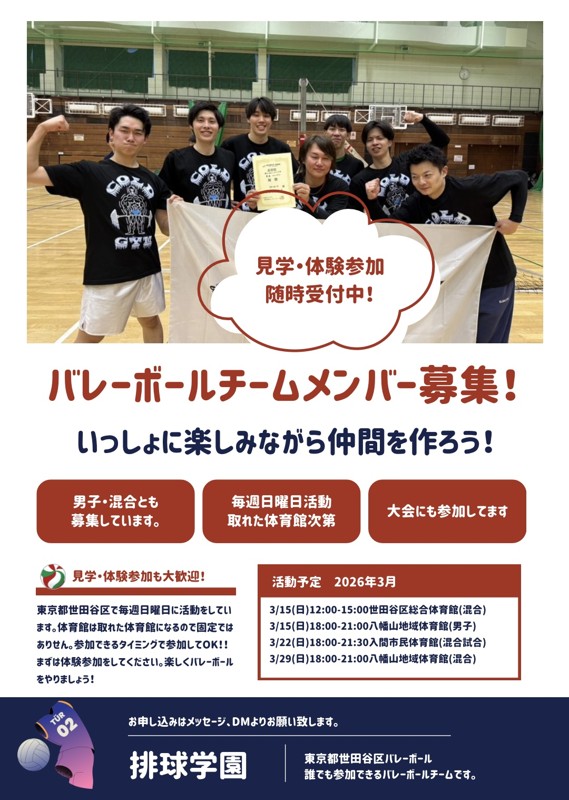 | 連絡事項や アピールポイント | 排球学園の紹介をします。 排球学園には ●6人制男子チーム ●6人制男女混合チーム があります。 メンバー総数30名が頑張っています。 新規メンバー大募集中です!! ブランクあっても大丈夫です!! 楽しくみんなでやっていきましょう!! 活動場所:世田谷区内の小学校体育館 活動時間:男子チーム :混合チーム 取れた体育館での活動となります。 13:00〜21:00のうち4時間が基本となります。 排球学園のメンバーの年齢は20歳〜40代となります。 同世代の友達もできるこの環境で是非バレーボールをやりませんか?? 色々なメンバーが頑張っています。 良い出会いがあればと思ってます。 気になった方はご連絡ください。 初回の体験参加は可能です。 返信が遅くなることがあります。 気長に待ってもらえたら助かります! |