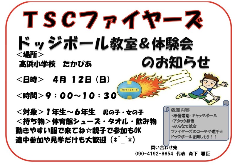 | 連絡事項や アピールポイント | こんにちは! TSCファイヤーズは、高浜市と近郊地域にお住まいの小学生が集まるドッジボールクラブです。 『楽しく』そして『熱く』が当クラブの基本です。 試合に勝つことだけではなく、 『あいさつをしっかりする』『相手を思いやる』といった心得のもと、日々頑張っています。 ドッジボールのスキルUPはもちろん、走る・投げるといった基礎体力作りにいかがでしょうか? 現在、高浜市、刈谷市、半田市、武豊町、東浦町の子供達が参加してます。 碧南市、大府市からも30分圏内です。 練習見学・体験も随時受付中です。 気軽にご連絡ください! ※当クラブは保護者の方に練習や試合への出席を強制することはありません。 クラブの見学や活動のお手伝いは大歓迎です! 親御さんの参加もOKです! 土日は大会や練習試合に変わることもあります。 |