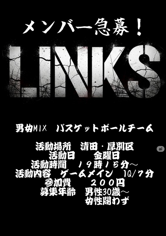 連絡事項や アピールポイント | 清田区を中心に活動してる LINKSです。 新規メンバーを大大大募集いたします! 【募集】 ・男性30歳~ 女性年齢問いません ・月1回以上参加、継続的に参加な方 ・グループラインでの参加有無をきちんと出来る方 【チーム構成】 ・チームメンバー 男性 10名 女性 3名 ・30代~40代で構成しており、平均年齢30歳くらい 【活動日時】 ・活動日 金曜日 ・場所 清田区・厚別区 ・時間 19時15分~21時45分まで 【活動内容】 ・7分のゲームメインです。 【料金】 ・1人200円 【持ち物】 ・チーム分けの為、白黒Tシャツ持参お願いします。 【チーム方針】 ・楽しくプレーできること! ・男女年齢差問わず、協調性をもって参加できること! ・個人プレーに走らないこと! ・チームプレイが出来る方 ・積極的にコミュニケーションをとろう! 応募の際、年齢・性別・バスケ歴等教えて下さい! 以上、LINKSの紹介でした。 楽しくバスケ出来る環境作りを目指してます! 是非一緒にバスケしましょう! 【次回予定】 10月予定 3日 厚別区 17日 厚別区 31日 清田区 ※ゲスト参加での募集は受けてません! |