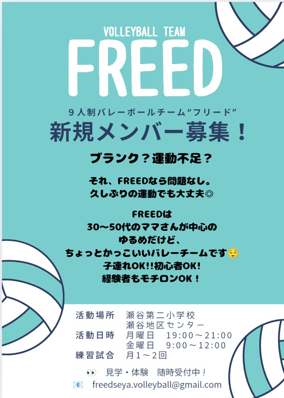 | 連絡事項や アピールポイント | 【9人制バレーボール FREED】 メンバー募集です! 横浜市瀬谷区内で活動している9人制ママさんバレーボールチームです!練習日の他に他チームとの練習試合があります! 明るく和気あいあい楽しく!がモットーです☆ バレーボール経験者、大歓迎!! メンバーの中には初心者からバレーボールを始めた人もいます!子連れ参加もしてきたメンバー多数ですよ! お問い合わせドシドシお待ちしてます! |