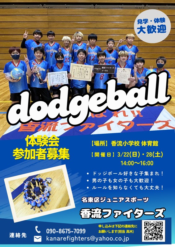 | 連絡事項や アピールポイント | 運動の得意な子も苦手な子… ドッジボールに興味のある子 友達がいっぱい作りたい子… 人見知りな子… 男の子も女の子も… みんな最初は初心者です。 私たちと一緒にドッジボールを楽しみませんか? 見てる大人もハマる熱いドッジボールです! まずは見学・体験してみてください! 尾張旭市・瀬戸市…名古屋市近郊からの参加も大歓迎です♪ 連絡お待ちしております。 ☆追伸☆ ・部費…300円/月 ・スポーツ保険…800円/年 ・その他、大会参加費等はその都度徴収します。 |