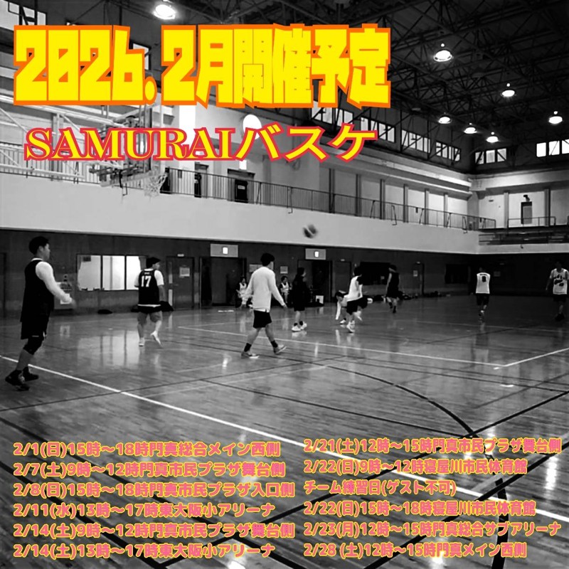 | 連絡事項や アピールポイント | 新規参加者募集 最近新規参加者増えてます! お気軽にお越しください バスケ好きなら楽しめると思います #サムライバスケ スポーツやろうよからの返答は 遅くなると思います。 インスタからのDMのほうが早いです。 開催日一週間前より受付可能 2026.2月開催予定 2/1(日)15時〜18時門真総合メイン西側 2/7(土)9時〜12時門真市民プラザ舞台側 2/8(日)15時〜18時門真市民プラザ入口側 2/11(水)13時〜17時東大阪小アリーナ 2/14(土)9時〜12時門真市民プラザ舞台側 2/14(土)13時〜17時東大阪小アリーナ 2/21(土)12時〜15時門真市民プラザ舞台側 2/22(日)9時〜12時寝屋川市民体育館チーム練習 2/22(日)15時〜18時寝屋川市民体育館 2/23(月)12時〜15時門真総合サブアリーナ 2/28 (土)12時〜15時門真メイン西側 男子練習試合も受付可能です お問い合わせお待ちしてます 開催予定変更追加する場合 ありますのでよろしくお願いします メンバー増えたので男子のみ 練習試合も受付可能です お問い合わせお待ちしてます 門真市民プラザ 門真市北島546 門真総合体育館 メイン、サブアリーナ 門真市中町11-70 東大阪小アリーナ 東大阪市中小坂4-7-60 寝屋川市民体育館 寝屋川市下木田町16-16 大東市民体育館 大東市寺川1-20-20 茨木市西川原体育館 茨木市城の前町1-3 参加資格 男女バスケ経験者 バスケ経験者のみ 18歳以上高校生不可 (初心者、未経験者、未成年不可) バスケ経験浅い方お断りします 個人プレーをやらない事 眼鏡禁止にしてます (スポーツゴール可) 活動内容 軽くアップしゲームします 練習はしません ゲームメインです チームわけは代表判断になります。 参加費500円 SAMURAIバスケの特徴 デジタルタイマーを使用し 毎回20人くらいで活動してます。 ゲームの回数が多いので がっつりバスケできます。 レベル 中級程度 インスタリール動画 YouTube動画 見てください 持ち物 白シャツ色シャツORリバーシブル チーム分けに必要です。 ゲームで使用します ボールの貸し出しはありません 参加申請は 1名前(山田太郎) 2年齢(25) 3バスケ暦(中学、高校、社会人7年) 4性別(男子) 5参加希望日8/20(土)12時〜15時寝屋川 グループ参加は 本人含め3名までとします 条件に合わない方は お断りする場合があります。 参加申請する場合は、 必ず1〜5を申請してください 上記を書いてない場合は、 返答しない場合があります レベルが合わない場合は、 次回からお断りする事があります コロナ対策の為のマスク着用等 体育館のルールを必ず遵守してください お連れ様を連れてくる場合 必ず連絡ください QRコードから インスタのDMの方が返信早いです FacebookやインスタやYouTubeに 活動動画掲載してますので 参考にしてください。 検索 #サムライバスケ #大阪バスケ ホームページの注意事項を 参加前に必ずお読みください #大阪バスケ #バスケ男子 #バスケ メンバー減少により 新メンバー募集します! SAMURAIのメンバーになりませんか!? 参加者希望者は、お気軽に連絡ください! |