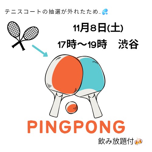 | 連絡事項や アピールポイント | いつもはテニスをやってますが、11月はコートの抽選が全部外れてしまったため卓球やります!!🏓 卓球楽しそう☺ テニスやる前にサークルメンバーと仲良くなっておきたい♪ テニスできるから卓球もできるはず …という方 ご参加お待ちしております✨ 【日時】 11月8日(土) 17~19時 【場所】 渋谷予定、ピンポンバー 【料金】 2500~3000円程度💰️ 飲み放題付き 【持ち物】 動きやすい服装 【応募方法】 氏名、連絡先(メールアドレス) 年齢、性別、テニス経歴を記載して頂き下記アドレスにご連絡お願いします✉️✨ tnt.enjoy.tennis@gmail.com もしくは、当サイト連絡方法にて上記内容を記載してメッセージをお送り下さい💻️ 定員がありますので、両日希望の方は第一希望と第二希望も記載頂けると幸いです。 【Instagram】 https://instagram.com/tokyo_nexus_circle?igshid=OGQ5ZDc2ODk2ZA== 【注意事項】 ●キャンセルの場合は前日までにご連絡ください⚠️ ●ナンパ目的での女性メンバーに対する過度なセクハラ・下ネタ・迷惑行為はご遠慮ください⚠️ ●ネットワークビジネス、宗教の勧誘はご遠慮ください⚠️ *・゚・*:.。.*.。.:*・☆*・゚・*:.。.*.。.:*・☆*・゚・*:.。*・゚・*:.。 お読み頂き、ありがとうございます☺️ 在宅ワークでの運動不足を解消したく、立ち上げた社会人のテニスサークルです♪ テニスやってみたいけどスクールはハードルが高い…💦昔テニスやってたけど一緒にやる友達がいない!そんな方、気軽にテニスを一緒にやってみませんか? 初心者も経験者も、一緒にわいわい楽しめるサークルです。 ※ガチ勢はご遠慮するか、力抜いてご参加下さい😇 ご応募お待ちしております‼️ *・゚・*:.。.*.。.:*・☆*・゚・*:.。.*.。.:*・☆*・゚・*:.。*・゚・*:.。 |