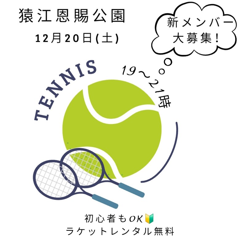 テニス東京東京のテニスチームです。現在、メンバーを募集しています。募集しているのは12月20日(土)初心者歓迎‼️男女どちらも🙆20代募集🔰。テニスに興味がある方は、ぜひご応募ください。| 募集の状態 | 募集中 |