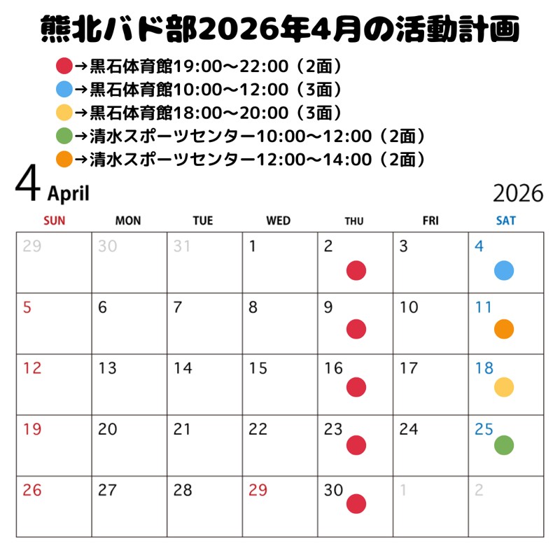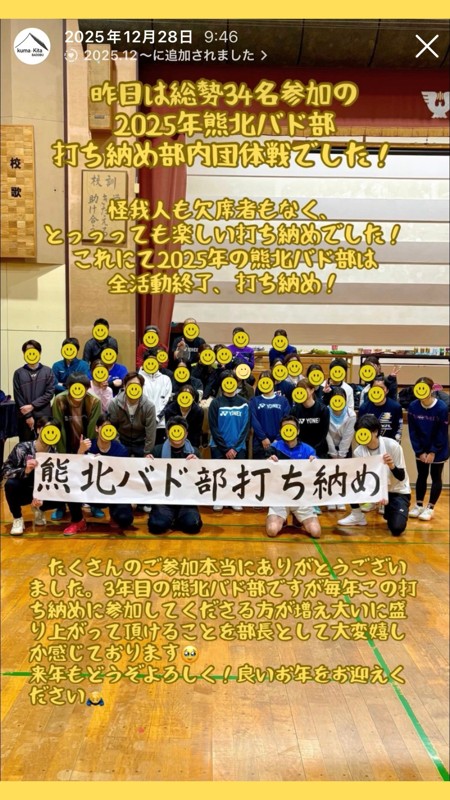 | サークル名 | 熊北バド部@40代・初級者さん・ブランクさん多め🏸 |