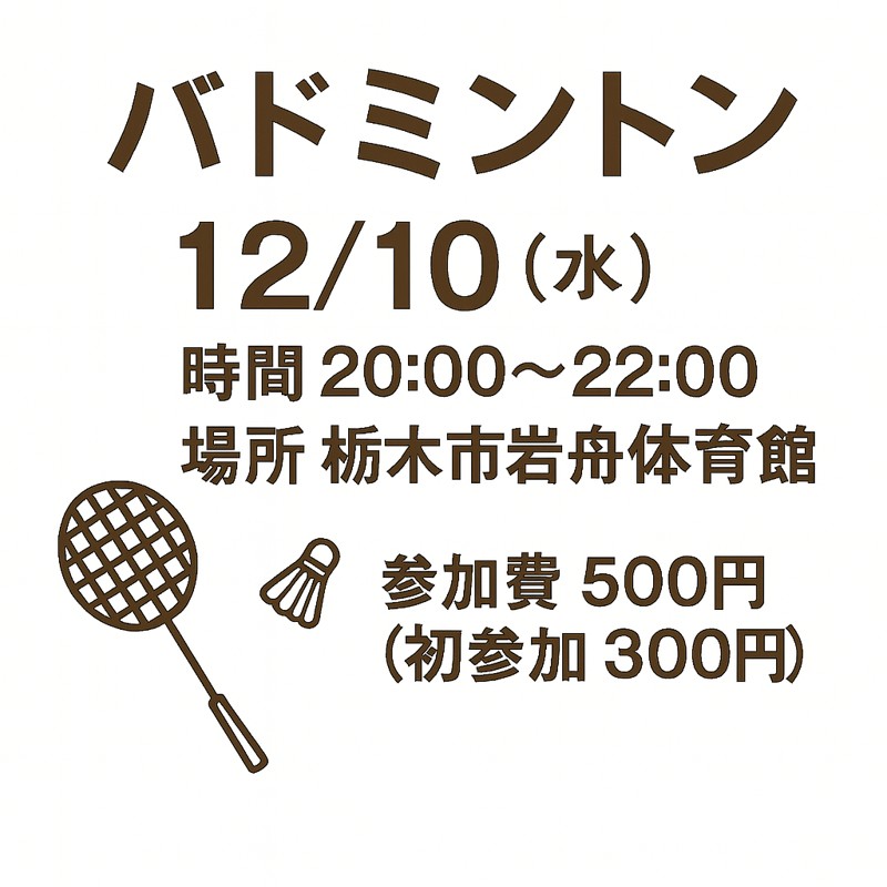 | 連絡事項や アピールポイント | 投稿を見てくださりありがとうございます! 12月の日程更新致しました! 📅開催情報 ・日程:11/10(水) ・時間:20:00〜22:00 ・場所:岩舟体育館 https://maps.app.goo.gl/JLd42h3RmE4ePYmp8?g_st=ic 💰参加費 ・一 般 → 500円 ・学 生 → 300円 ・初参加 → 300円 ※当日現金払いになります 🎒持ち物 •ラケット(貸し出しあります) •室内用シューズ •飲み物(近くに自販機あります) •タオル 運動不足を解消したい人、新しい趣味を探してる人、大歓迎です! 参加希望や質問は、お気軽にコメントしてください! |
