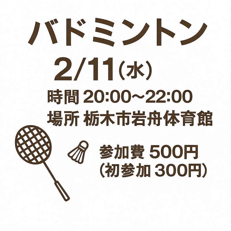 | 連絡事項や アピールポイント | 投稿を見てくださりありがとうございます! 1月の日程更新致しました! 📅開催情報 ・日程:2/11(水 ・時間:20:00〜22:00 ・場所:岩舟体育館 https://maps.app.goo.gl/JLd42h3RmE4ePYmp8?g_st=ic 💰参加費 ・一 般 → 500円 ・学 生 → 300円 ・初参加 → 300円 ※当日現金払いになります 🎒持ち物 •ラケット(貸し出しあります) •室内用シューズ •飲み物(近くに自販機あります) •タオル 運動不足を解消したい人、新しい趣味を探してる人、大歓迎です! 参加希望や質問は、お気軽にコメントしてください! |