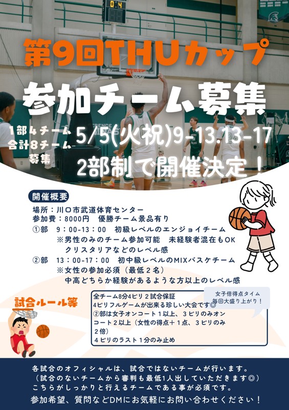 | 連絡事項や アピールポイント | ⁂日時 【第9回THUトーナメント】 2026年5/5(火祝) 場所📍川口体育武道センター(JR京浜東北線川口駅から徒歩15分) 駐車場有🅿 ①部 9:00~13:00 (男性のみエンジョイチーム) ②部 13:00~17:00 (エンジョイMIXバスケチーム) 二部制での開催(各4チーム募集) 今大会は様々なご意見を踏まえ、カテゴリーを分けて2部開催となります◎ どちらの部も優勝賞品はなんと 7号公式球!✨ 参加費のもと余裕で取れます(笑) チーム活動で使用する公式球をゲットしちゃおう○ 2ピリではなく4ピリでの試合が出来、かつ4ピリが2試合保証の 非常に珍しい大会です◎ ①部 9:00~13:00 (男性のみエンジョイチーム) ・初中級レベルのエンジョイバスケチームレベル ・男性のみで構成されるエンジョイチーム様可能 ・クリスタリアに出場しているようなチーム様向け ・未経験者、経験浅い方の混在OK ※男子で市民大会、県リーグに参加している方のみで構成されているような チーム様は不可、あくまで普段エンジョイチームとして活動しているチームで 参加したいけど、女性が集まらないとのお声が多かったので、そういったチーム様向けです。 ※女性がいる場合は午後のMIXの部のご参加をおすすめいたします。 ②部 13:00~17:00 (エンジョイMIXバスケチーム) ・初中級レベルのエンジョイMIXバスケチーム ・女性の参加必須(2名以上) ・完全未経験者混在は厳しいレベル感 ・MIXでクリスタリアに参加されているようなチーム様 ※全員が男女ともに市民大会に出ているようなチーム様は不可 最高でも市民大会参加者、エンジョイのみの方、 半々くらいでの割合でお願いします。 申し込み締め切りは4/25(土)までとなっております。 是非ご検討ください^^ ※参加確定後のキャンセルはキャンセル料全額支払いか 他に出られる代打チームをご用意していただきます。 MIX総当たりリーグ、トーナメント大会の 第9回開催が決定致しました! 今回はトーナメント形式での大会となります。 2024年は、3月、7月、8月、12月と4大会 2025年は、2月、7月、11月と3大会 2026年は、2月に1度開催済み 大会を開催することが出来ました。たくさんのチーム様にご参加いただき 大変感謝しております。 2026年の2回目となりますのでぜひご参加お待ちしております^^ 【参加費】 1チーム8000円 優勝チームに豪華景品有◎(参加費の元、余裕で取れます!(笑)) 【試合数】 全チーム8分4ピリ、2試合保証 4Qのフルゲームが出来る大会はなかなかないと好評です。 勝ち同士、負け同士の試合有り 【ルール】 ・各試合のオフィシャルは、試合ではないチームが行います。 (試合のないチームから審判も最低1人出していただきます◎) (試合のないチームと半々でやるので審判出来る方が1人いれば🆗) ・タイムアウトは、各チーム前半後半1回のみ可能 ・4ピリのラスト1分のみ止め ②部のみの特別ルール ・女子オンコート1以上、3ピリのみオンコート2以上 (女性の得点+1点、3ピリのみ2倍) 【参加条件】 ・オフィシャルができるチームである事 (レフェリー、タイマー、スコア、24秒など) ・5名ぴったりでのご参加は、怪我等のリスクのためご遠慮ください。 最低でも6名以上でご参加ください。 (だいたい各チーム8-10名前後で参加されるチーム様が多いです◎) ・ユニフォームデザインや色の統一はしなくても大丈夫です! 紛らわしい色無し、背番号のついているもの 参加ご希望のチームは、メッセージお待ちしております◎ その他、ご質問などございましたらお気軽にお問い合わせください。 MIXバスケ ミックス大会 MIX大会 |