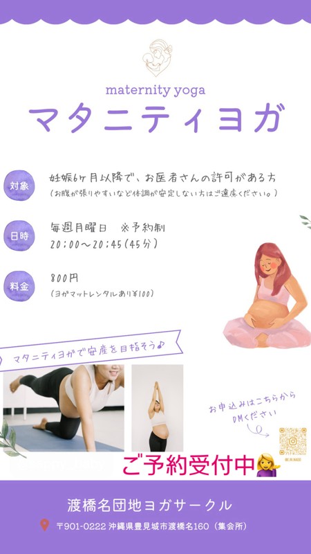 | 連絡事項や アピールポイント | 深い呼吸を行い、身体の内側からじんわり温めていきます。 自分時間を確保して、ヨガで心も身体もリフレッシュしませんか?(^^) 一つひとつのポーズをゆっくり丁寧に行っていきますので、 初心者の方や身体がかたい方でもチャレンジしやすいクラスです。 ☆ストレス発散 ☆気分転換 ☆運動不足解消 【糸満市】新川公民館 1レッスン60分 1,000円(ヨガマットレンタル100円) 【豊見城市】県営渡橋名団地集会所 1レッスン 800円(ヨガマットレンタル100円) ⭐︎月曜日は、マタニティヨガクラス※予約制⭐︎ 動きやすい服装で、飲み物、フェイスタオル、 ヨガマットをお持ちいただいてお越しください(^^♪ ご予約者優先でご案内いたします。 お休みの日もありますので、お気軽にご連絡ください♪ |