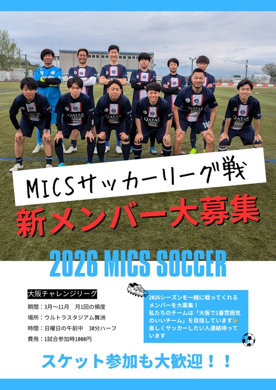 | 連絡事項や アピールポイント | 私たちは2025年4月から始まる此花区の舞洲独立リーグに参戦するできたばかりのチームです! これからチームを1から作っていきますのでメンバーを大大大募集します!! チームのコンセプト ・仲間には絶対に文句、厳しい指示を言わない ・仲間をリスペクトし合える大人チームを目指しています ・ただ強いだけのチームをではなく、信頼し合える仲間づくりをしたいです ・仲の良いメンバーでやるサッカーほど楽しいものはないですからね♪ 応募希望の方へ ・応募の際は名前と参加したい日程をご連絡ください ・まずは合うかどうか気軽に参加してみてください✨ ・リーグの年会費はありません、参加時のみ1000円程度となります ・ユニフォームは正式メンバー入りの方のみで、ホーム&アウェイ+パンツで4000円)となります → スケット参加者は試合のたびにこちらからお貸しします✨ ・リーグがない月は、紅白戦か練習試合を行います 🍃基本情報 ・費用 : 500円~1500円(会場による) ・頻度 : 月1回程度 🍃ゆるさ ・強制参加一切なし(参加したいときだけ) ・連絡はしっかりお願いします(遅刻・キャンセル等) 🍃禁止事項 ・ネットワークビジネスや宗教、他サークルの勧誘行為は一切禁止としています!純粋にスポーツを楽しみたい方のみご参加ください 🍃大事にしていること ・楽しくサッカーをやりたいので仲間に対して暴言は絶対にNG、厳しい指示もNGです!「ナイスプレー♪」「ドンマイ♪」等ポジティブな声かけのみでお願いします 🍃持ち物 ・スパイク ・運動できる格好 ・給水できるもの ~~~~~~~~~~~~~~ 🍃活動予定 ウルトラスタジアム舞洲 ・3/22(日) 11-13時 舞洲リーグ 開幕戦 満員 ・4/26(日) 9-11時 舞洲リーグ 第2戦 参加費1000円~1100円(人数によります) ~~~~~~~~~~~~~~ 🍃代表の簡単な挨拶 ・私は仕事のストレスで精神が壊れそうな時、スポーツに救われた経験があります。そこからスポーツの持つ力をとてもリスペクトしていて、生涯にわたってスポーツを取り入れていきたいと考えています!そしてどうせスポーツをやるなら仲良い人たちとやりたい!スポーツを通してたくさんの仲間を増やしたい!と思い自分でスポーツサークルを立ち上げて活動しています! ・参加者全員が楽しくスポーツをできることを第一に考えて運営しているので、是非一度お試し参加をしてみてください!(リピート率からも、参加者の満足度は高いと思われます😂) ・詳しくはサークルのHPを見てみてください↓ https://www.mics-oosaka.com/ |