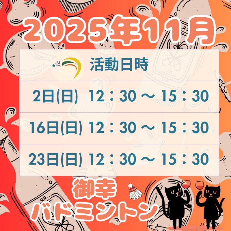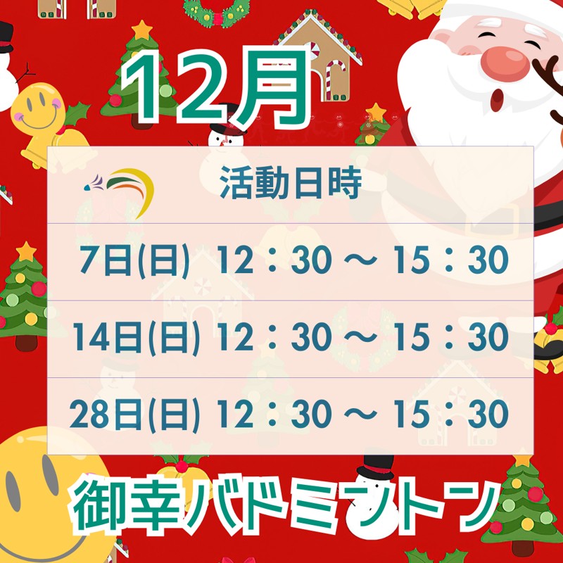 | 連絡事項や アピールポイント | 学生時代からの経験者が多く、楽しくバドミントンしています。 現役の体育会大学生の参加もあり、ダブルスのゲームだけでなく、シングルスも可能です。 真剣に楽しくバドミントンをしたい方のご参加をお待ちしています。 練習日や詳細はホームページに掲載していますので、興味を持たれた方は是非ご連絡ください! 【2025年12月の予定】 7日(日)12:30~15:30 14日(日)12:30~15:30 28日(日)12:30~15:30 場所: 西御幸小学校の体育館 参加費:1000円 |