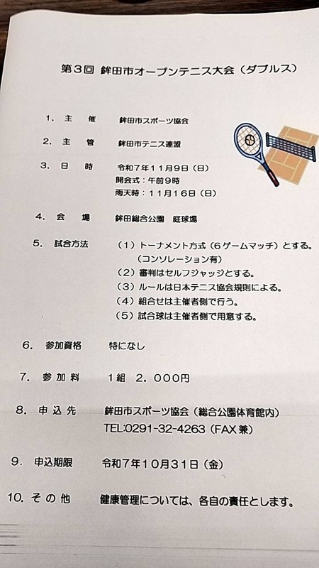 連絡事項や アピールポイント | ※練習会目的 サークル活動が無い日にちょっと練習したい方。 ※交流会目的 他サークルとの練習試合(気楽な方行で)。 大会参加前に試合慣れしておきたい方。 パートナーとの連携確認&技術向上したい方。 2025年参加者募集中 今年も宜しくお願い致します。 練習会参加者募集中 交流戦参加者募集中(チーム&個人) 現在、参加者 名(女性 人)程度 2025年 7~9(水)14:00~16:00 参加2~3名 会費100~200円 2024年 12/8(日)交流戦結果 参加36名、お子様3名 9:00~15:00 会費500円 鉾田総合運動公園コート ダブルス 4ゲーム先取、ノーアド 参加サークル ガレオス、MTC(みんなでテニス)、 オリーブ(混成チーム)、鉾田ローン ※無事終了しました。 ※有り難うございます。 交流戦 最低限のマナーが必要。 「楽しくテニス、試合に慣れる」が目標なので、 人のミスを笑う方は御遠慮ください。 練習会※連絡頂いて日時を相談。 空いた時間を楽しむのが目的なので、 コート使用にはこだわらず、 運動公園の芝のうえで、 軽いボレーの練習をする場合もあります。 |