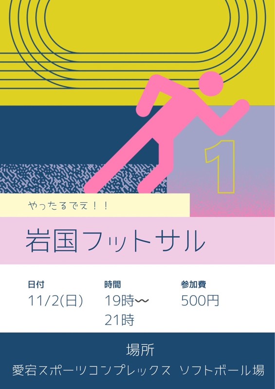 | 連絡事項や アピールポイント | 月1回のペースで定期的にフットサルできるようにメンバーを募集してます。 フットサルの時間は1.5時間程度行います。 1時間ほど練習して30分ミニゲームできたらと思っています♪ 初心者・女性がメインなので、 フットサルやりたいけど、 ガチでやるのはちょっと、、、 ボールをどう蹴ればいいか分からない💦 という方大歓迎です✨️ みんなで練習しながら上達していきましょう😆 練習は基本的に パス練習⚽️ ドリブル練習⚽️ シュート練習⚽️ を1時間ほど行います⚽️ ミニゲームはだいたい6〜7分/1ゲームで行います! 開催日は決まり次第随時記載していきます^_^ 連絡お待ちしてます♪ 怪我をしないように準備運動しっかりしてから 体を動かしましょう! ※送迎なども可能です。 ※屋外のため雨天の際は中止になります 【持ち物】 ・運動出来る服装 ・汚れてもいい靴 トレーニングシューズ・フットサルシューズ可 ※ポイントのあるスパイクは怪我防止のためご遠慮ください 参加費 500円/1人 をフットサル終了後に会計係が 集めますので、スムーズな運営に ご協力お願いします🙏 今後の開催日程です☺️ 日程:11/2(日) 場所:愛宕スポーツコンプレックス ソフトボール場 時間:19:00〜 |