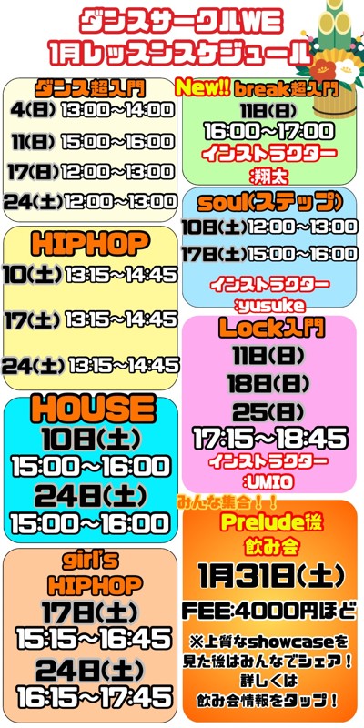 | 連絡事項や アピールポイント | 社会人ダンスサークルWEです😊 【各月の活動日程表は画像をご参考ください】 【🆕5月の日中のダンスイベントに出演します!メンバー募集してますので、質問でも何でもお申し付けくださいませ☺️】 梅田で未経験や初心者の方向けに ダンスレッスンを開催しております。 最近では元々経験者で 昔ダンスをしていたがまた再開したいが 大手のスタジオに行くのはちょっと、、 という方も来られています! 活動に関しては土日の12時から19時までやっていますが、基本は受けたいレッスンだけを受けていただくスタイルです! 毎週やっていますが皆さんマイペースに参加しています😊 【こんな方はどうぞ!】 普通のスタジオだと行きにくい、 行ったけど難しかった(゚Д゚;) 運動音痴だけど不安だ(-_-;) リズム感、音感無いんだけど、、(´;ω;`) そういう方が楽しめるように丁寧に優しく レッスンを行っているのでこの機会を ものにしちゃって下さい😊 一つ一つ丁寧に指導させて頂きます! 基本的には誰でもウェルカムです✨😂 舞台に出たい方やイベントに出たい方は 専用にグループを組んでいます!(^^)! ダンスだけでなくレッスン後のトークや仲間作りを 楽しみに来られている方も沢山いますよ! ダンスを通じて日常に笑顔と刺激を提供できる 大人のコミュニティの場にしたいと思っています! ジャンルはHIPHOP、Lock、POP、girl's、KPOPです! 1レッスンは60分か90分で 入門か初級に分かれています。 60分レッスンは1500円です。 90分レッスンは2000円です。 超入門は50分一律1000円です。 流れとしては 【自己紹介】→【ストレッチ】→ 【レッスン】→レッスン後【フリータイム】 となっております。 超入門はよりベーシックな体の使い方や 簡単な技とステップで汗をかいてダンスに馴染んでいく場にしております。 運動が苦手な方やリズム感覚に不安がある方でダンス未経験の方はぜひどうぞ! 入門は簡単なステップやリズム取りを何種類か教わり、組み合わせて簡単なルーティンを繰り返します。 運動経験があってもダンス未経験の方や基礎を見直したい方にピッタリ! レッスンは初級ということでスキルをお伝えして、 簡単な振り入れをして何度もルーティンを踊る流れです。 ダンス歴半年以上の方向けのしっかり踊るレッスンです。 ダンスした事ないけどやってみたい、 興味がある方は是非! 内容は初めての方〜初心者、経験者やブランクのある方も 楽しめる内容となっております。 ベーシックのステップ1つをメインにそこから 派生させてレッスンしていきますので安心して お越し下さいませ😊 次回は 【HIPHOP入門初級】 1/10 13:15~14:45 1/17 13:15~14:45 1/24 13:15~14:45 の時間帯で開催します☺️ レッスン費用は2000円です。 【girl'sHIPHOP入門初級】 1/17 15:15~16:45 1/24 16:15~17:45 一律2000円 【スタイルHIPHOP(入門)】 1/24 19:15~20:45 の時間帯で開催します☺️ 特に年齢制限はないです。 レッスン費用は2000円です。 【ダンス超入門】 1/4 13:00~14:00 1/11 15:00~16:00 1/17 12:00〜13:00 1/24 12:00〜13:00 超入門は一律1000円です。 【House】 1/10 15:00~16:00 1/24 15:00~16:00 入門 一律1500円 【Lock入門】 1/11 17:15~18:45 1/18 17:15~18:45 1/25 17:15~18:45 レッスン料:2000円 【Lock超入門】 2026年ころ 一律1000円 【soul】 1/10 12:00~13:00 1/17 15:00~16:00 【POP】 1/11 15:00〜16:00 参加費1500円 【break超入門】 1/11 16:00~17:00 参加費1000円 【KPOP】 kpop部で募集してます。 気になる方は何でもお気軽にご連絡下さい! お友達同士の参加も大歓迎です! 今来ているメンバーは女性も多く、 男女比も4:6です。 初級は7名以上が常に参加してます。 入門レッスンはだいたい少人数3~6名前後ですので 必ずフォローしますので安心してお越しください! 大人からダンスを始めた方ばかりの方が 9割と多いのでお気軽にお越し下さいませ😊 ダンスを通してみなさんと楽しい時間を過ごせる事を 楽しみにしております☺️ ※勧誘目的、ナンパ目的の方は禁止としています。 発見した場合は拳骨です。 |