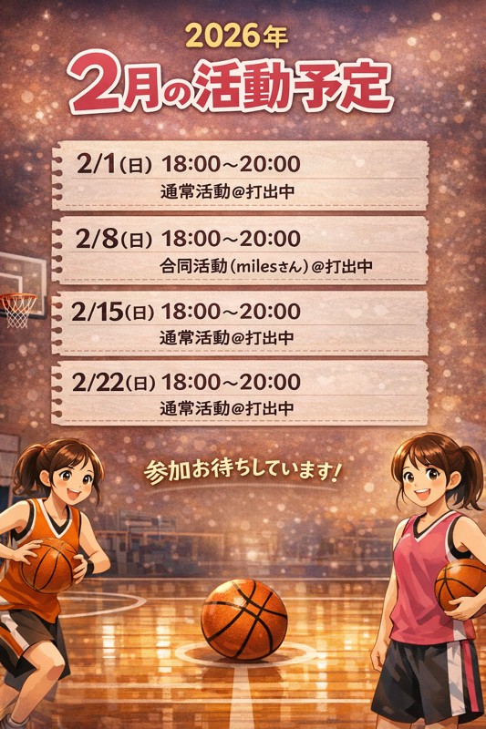 | 連絡事項や アピールポイント | 🟩バスケで体を動かしたい女性の方を募集します!2022年11月に立ち上げたサークルで、現在メンバーを募集中です!! 🟪ブランクありでも未経験でも大歓迎です! (ちなみに、現在経験者49人と未経験者13人が集まってくれてます) 🟧雰囲気 ゆる〜い雰囲気です☺️ インスタで雰囲気見れます! 詳細は「バスケ好き女子の集い」で検索!! ⚫︎こんな人にオススメ ・好きな時に参加できる自由な雰囲気のサークルに行きたい ・休みの日やお仕事/学校終わりにリフレッシュしたい ・1人でも参加しやすいサークルに行きたい 🔹今後の活動🔹 【2026年】 2/1(日) 18:00〜20:00 通常活動@打出中 2/8(日) 18:00〜20:00 合同活動(milesさん)@打出中 2/15(日) 18:00〜20:00 通常活動@打出中 2/22(日) 18:00〜20:00 通常活動@打出中 3/1(日) 18:00〜20:00 通常活動@打出中 3/8(日) 18:00〜20:00 通常活動@打出中 3/15(日) 18:00〜20:00 通常活動@打出中 3/22(日) 18:00〜20:00 通常活動@打出中 3/29(日) 18:00〜20:00 通常活動@打出中 ★参加費は一人1回200円です。 ★興味がある方は、名前(下の名前のみで可)と年齢、バスケットボールの有無をコメントください。まずは1〜2回体験で参加いただいてから、良ければグループの招待を送ります。 ★参加人数が4人未満の日は活動は中止します。 ★宗教・その他勧誘は固くお断りします。 |