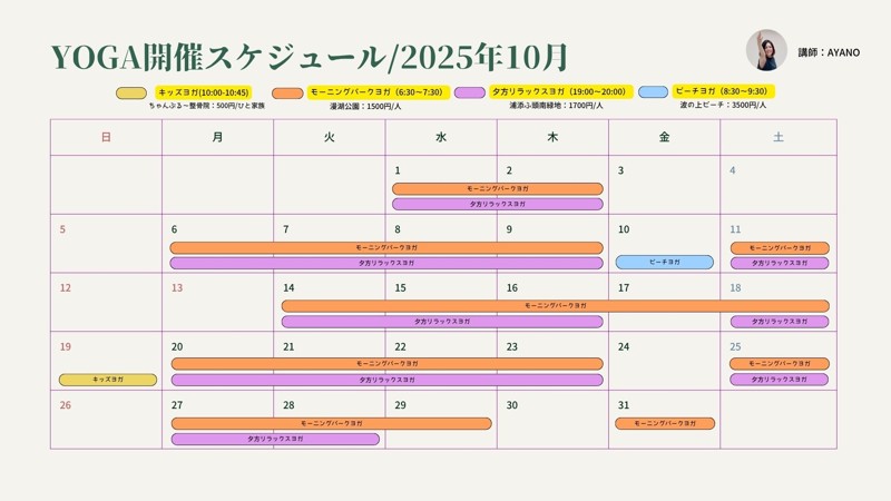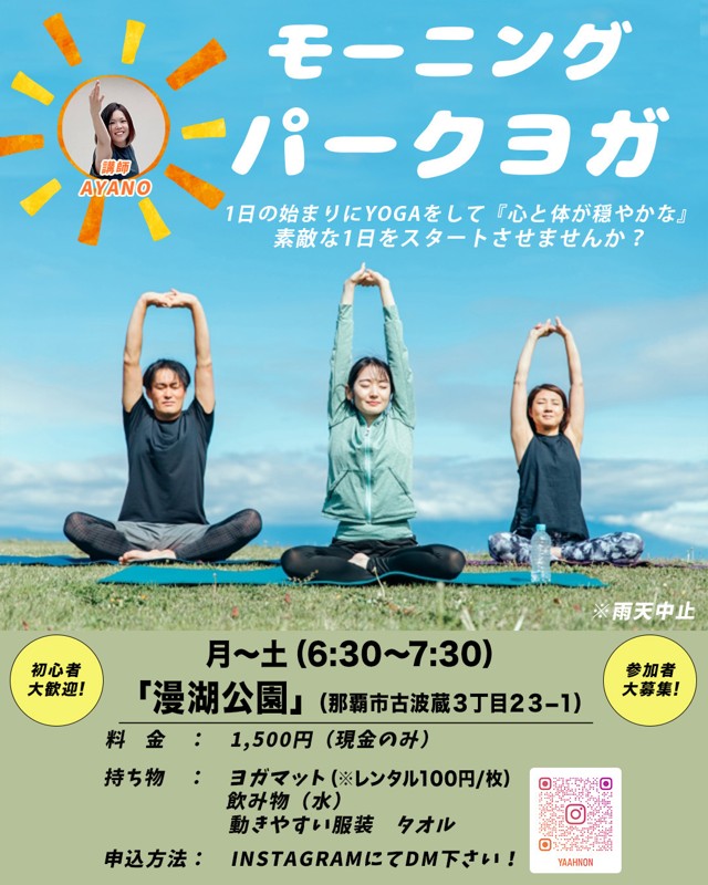 | 連絡事項や アピールポイント | 📣一緒に朝活しませんか?📣 日時: 月〜土曜日 (予約レベルで毎日開催!) 時間: 6:30〜7:30 場所: 漫湖公園(那覇市古波蔵3-23-1) 料金: 1500円(現金のみ) 持ち物: ヨガマット 飲み物 タオル 動きやすい服装 (マットレンタル 100円) 🥳ご予約は前日の17時まで受け付けてます🥳 ☀️朝活のメリット☀️ ✅1日の時間を有効に使える! ✅集中力up! ✅生活リズムが整う! ✅朝日を浴びて、夜ぐっすり眠れる! 🧘ヨガのメリット🧘♀️ ✅ストレスの低減! ✅自己肯定感up! ✅姿勢が良くなる! ✅前向きな気持ちになる! 朝活☀️×ヨガ🧘♀️で心と身体が穏やかな Happyで素敵な1日をスタートさせませんか?❤️ お気軽にご参加下さい😊 |