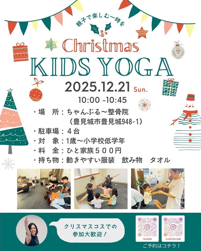 | 連絡事項や アピールポイント | 日曜日、何して過ごそう?🤔😱と悩んでいる、お父さん、お母さん、おじいちゃん、おばあちゃん 私達と一緒にキッズヨガをしませんか?❤️ 日時: R7.12.21(日) 場所: ちゃんぷるー整骨院 駐車場4台有り (豊見城市豊見城439-1) 時間: 10:00〜10:45 料金:ひと家族500円 ※現金のみ 持ち物: 動きやすい服装 飲み物 毎月1回、日曜日に開催しています! キッズヨガ終了後には子供達へお菓子のプレゼント🎁もあります! 子供達の楽しんでる姿に癒されますよ🥰 子供何名様でもひと家族500円です! 対象年齢は1歳〜小学低学年とありますが、3ヶ月の赤ちゃん〜小学6年生まで参加されてます🤸♂️ ベビーベッドもありますので、首が座らない赤ちゃんも安心です☺️ お問い合わせお気軽にどうぞ🙌 📣12月はクリスマスコスプレでの参加大歓迎📣 |