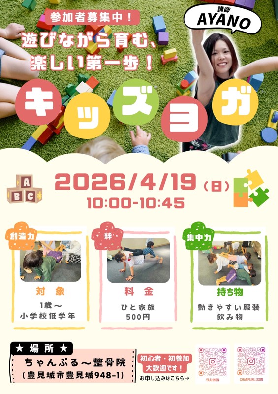 | 連絡事項や アピールポイント | 日曜日、何して過ごそう?🤔😱と悩んでいる、お父さん、お母さん、おじいちゃん、おばあちゃん 私達と一緒にキッズヨガをしませんか?❤️ 日時: R8.4.19(日) 場所: ちゃんぷるー整骨院 駐車場4台有り (豊見城市豊見城439-1) 時間: 10:00〜10:45 料金:ひと家族500円 ※現金のみ 持ち物: 動きやすい服装 飲み物 毎月1回、日曜日に開催しています! キッズヨガ終了後には子供達へお菓子のプレゼント🎁もあります! 子供達の楽しんでる姿に癒されますよ🥰 子供何名様でもひと家族500円です! 対象年齢は1歳〜小学低学年とありますが、3ヶ月の赤ちゃん〜小学6年生まで参加されてます🤸♂️ ベビーベッドもありますので、首が座らない赤ちゃんも安心です☺️ お問い合わせお気軽にどうぞ🙌 |
