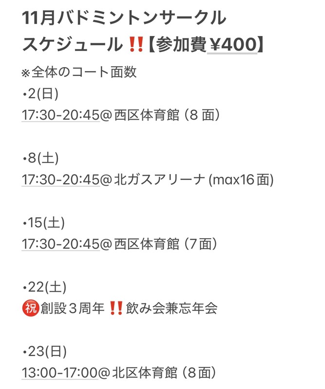 現在、札幌市内でバドミントンサークルを探しているのですが、活動が盛んな区について伺いたいです。 - 回答:【SB】11月で㊗️③周年❗️11月後半の予定UP‼️ 2025年06月09日