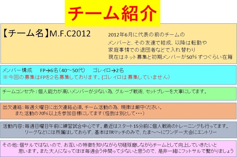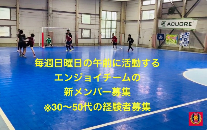 | 連絡事項や アピールポイント | 日曜日の朝に活動している エンジョイチームです、 退団者に伴い新規メンバーを2名募集します。 ※経験者のみの募集です。 【活動場所、活動日】詳細は画像にてご覧下さい。 活動場所→メイジ屋内コート 活動日→毎週日曜の午前中 (9~13時のうち2時間) ※月1の日曜日は休みですので、 月3~4回の活動です。 (必ず毎回出席でなくてもOKですが、 70%が参加目標です) 【目標】 リーグなどには出る予定はないですが チームとしてレベルアップ。 個人プレーより、チームプレーを優先。 ゲーム前の10~15分で少し練習して どこをポイントに攻めるをお伝えします。 ※特に2人組のところを重視してます。 【メンバー構成】 30~50代までの男性のみ! 全員がフットサルまたはサッカーの経験者 ※40代が大多数で、経験はそれぞれです。 応募についてはメッセージにて 御名前、年齢、経験などを記載し ご連絡下さい。 よろしくお願いします。 |