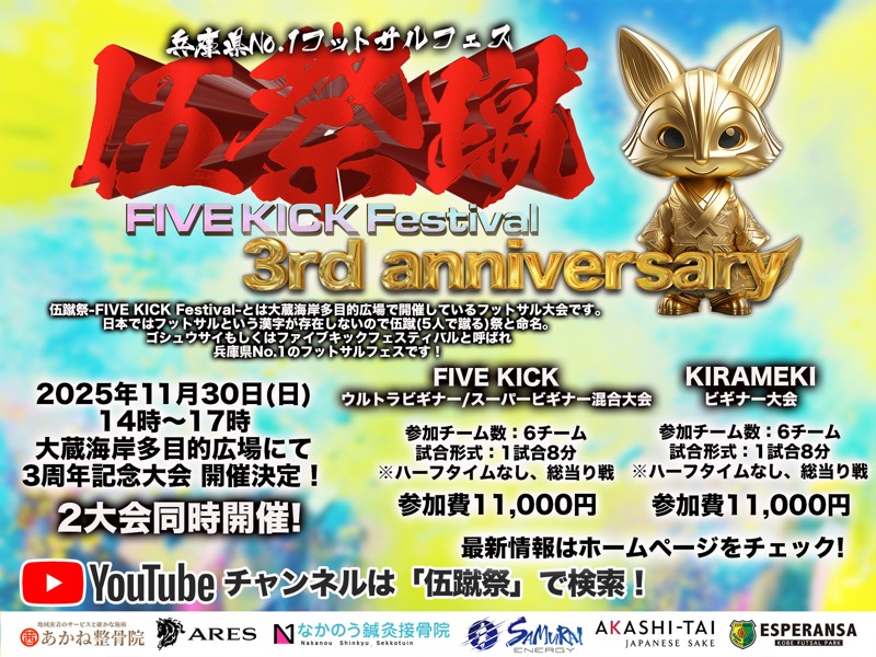 | 活動時間 | 伍蹴祭-FIVE KICK Festival-大会参加 14時~17時(変更の場合あり) |