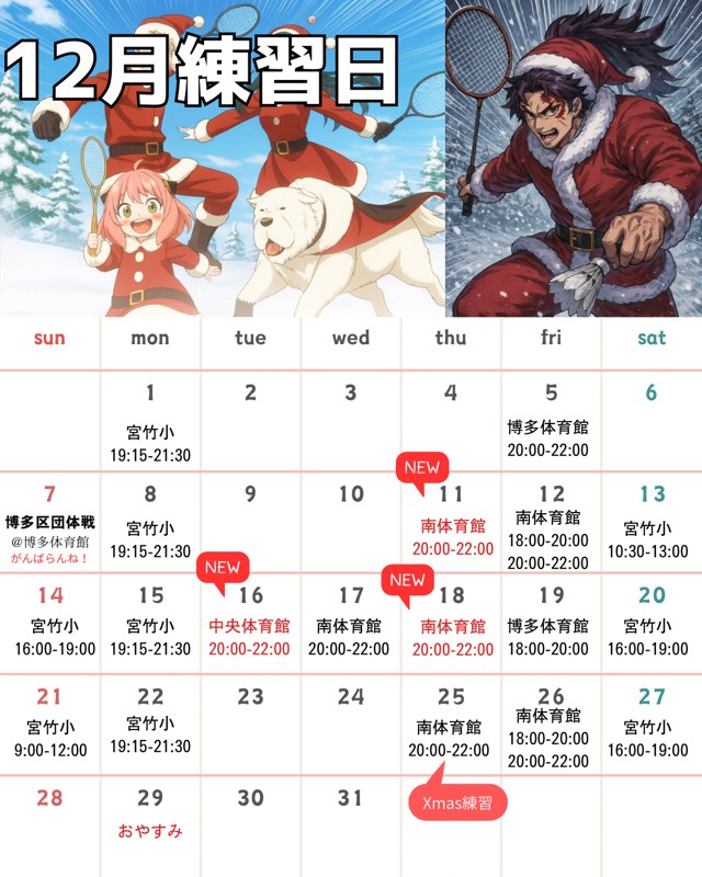 | 連絡事項や アピールポイント | 🌸 初心者さんも安心!楽しく体を動かせるバドミントンサークル 🌸 「勝ち負け」よりも「バドミントンを楽しむこと」と「少しずつ上達すること」を大切にしています。 ちょっと体を動かしたい、練習したい、都合の良い回だけ参加したい…そんな方も大歓迎!遅刻や早退も自由です。 📌 主催について 運営しているのは、バドミントン大好きな社会人です。 「誰でも安心して参加できる場を作りたい」という思いでサークルをスタートしました。 参加者全員が楽しく、公平にプレイできる環境づくりを最優先にしています。 📌 サークルの特徴 •初心者歓迎 → 基礎やルールも丁寧に教えます •経験者もOK → レベルに合わせて楽しめます •コーチング歓迎 → 参加者同士で助け合える環境 •優しいメンバー → 気遣いながら楽しくプレイ •参加自由 → 都合の良い日だけでもOK •ラケット貸出あり → 初めてでも安心 (シューズはお持ちください) 📌 活動スタイル •毎週月曜 19:15〜21:30 宮竹小学校 •毎週金曜 18:00〜20:00 / 20:00〜22:00 南・博多・中央体育館(予約状況により変動) •ほか平日夜や日曜朝、昼も不定期で開催中 •参加費:300円 •毎回25名程度で練習、年齢層は20〜40代が中心、 全体で男女150名程度在籍 📌 練習内容 1.基礎練習(30分) ペアでシャトルを打ちながら、基礎技術を身につけます。 初心者や打ち方が分からない方にも丁寧にサポートします。 2.試合形式ダブルス(80分) レベル差を考慮して公平な回数プレイできるよう調整。毎回全員が楽しみながら試合に参加しています! 3.片付け(10分) ネットやポールの撤収、床のモップ掛けを全員で協力。 みんなでやるのであっという間に終わります。 📌 雰囲気 •メンバーは気さくでフレンドリー、会話も楽しめます •試合の合間はリラックスして休憩、物足りなさそうな方はコート間ネットに集まってもらってミニゲームします •安全で公平に楽しめる環境づくりを徹底しています 🚫 安心のためのお約束 •中学生以下の方は必ず保護者同伴でお願いします •宗教・マルチ商法などサークルの趣旨と無関係な活動は禁止 •あからさまな異性目的の行動はご遠慮ください 参加者同士が自然に仲良くなるのは歓迎していますが、節度ある交流をお願いします! •危険行為、迷惑行為など、主催者が不適切と判断する行為は禁止 👤 主催者からひとこと 「バドミントンは誰でも楽しめるスポーツです。 初心者も経験者も、年齢や性別を問わず一緒に楽しめるサークルを目指しています。 仲間は優しくフレンドリーで、すぐに馴染めます。 楽しく体を動かしたい方、新しいことに挑戦したい方、ぜひ一緒にバドを楽しみましょう!」 📌 参加希望の方へ 以下をメッセージでお知らせください: •お名前、ご年齢、性別 •参加希望日 •参加人数 •バドミントン経験 •ラケット・シューズの有無 サークル公式インスタもあります。DMからの問い合わせも大歓迎 → smintonb で検索 ⭐️練習日程 各日定員があります。 お早めにお申し込み下さい 12/26(金) 18:00-20:00 南体育館 12/26(金) 20:00-22:00 南体育館 12/27(土) 16:00-17:00 宮竹小学校(基礎練¥0) 12/27(土) 17:00-19:00 宮竹小学校 12/29(月) 12:00-13:00 塩原中央公園(基礎練¥0) |