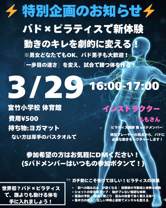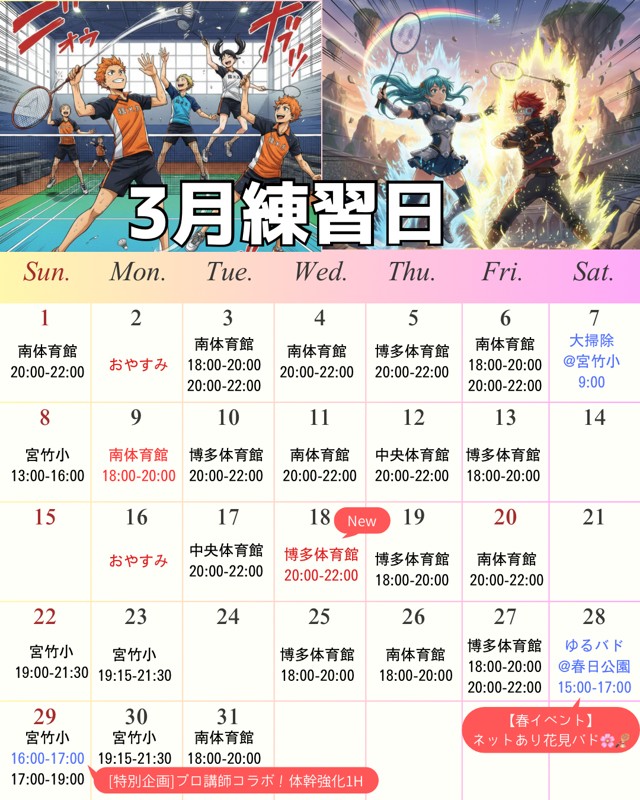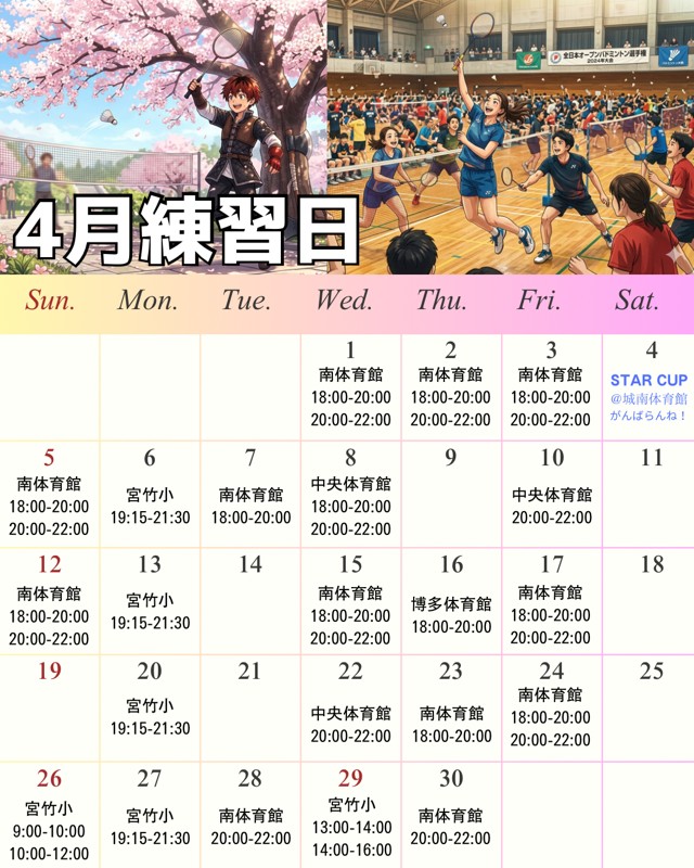 | 連絡事項や アピールポイント | 🌸 初心者さんも安心!楽しく体を動かせるバドミントンサークル 🌸 「勝ち負け」よりも「バドミントンを楽しむこと」と「少しずつ上達すること」を大切にしています。 ちょっと体を動かしたい、練習したい、都合の良い回だけ参加したい…そんな方も大歓迎!遅刻や早退も自由です。 📌 主催について 運営しているのは、バドミントン大好きな社会人です。 「誰でも安心して参加できる場を作りたい」という思いでサークルをスタートしました。 参加者全員が楽しく、公平にプレイできる環境づくりを最優先にしています。 📌 サークルの特徴 •初心者歓迎 → 基礎やルールも丁寧に教えます •経験者もOK → レベルに合わせて楽しめます •コーチング歓迎 → 参加者同士で助け合える環境 •優しいメンバー → 気遣いながら楽しくプレイ •参加自由 → 都合の良い日だけでもOK •ラケット貸出あり → 初めてでも安心 (シューズはお持ちください) 📌 活動スタイル •毎週月曜 19:15〜21:30 宮竹小学校 •毎週金曜 18:00〜20:00 / 20:00〜22:00 南・博多・中央体育館(予約状況により変動) •毎週土曜 16:00〜19:00 宮竹小学校 •第1・第3日曜 9:00〜12:00 宮竹小学校 •他の平日夜、祝日昼なども不定期で開催中 •参加費:300円 •毎回25名程度で練習、年齢層は20〜40代が中心、 (小学生やご年配の方もおります)全体で男女250名程度在籍 📌 練習内容 1.基礎練習(30分) ペアでシャトルを打ちながら、基礎技術を身につけます。 初心者や打ち方が分からない方にも丁寧にサポートします。 2.試合形式ダブルス(80分) レベル差を考慮して公平な回数プレイできるよう調整。毎回全員が楽しみながら試合に参加しています! 3.片付け(10分) ネットやポールの撤収、床のモップ掛けを全員で協力。 みんなでやるのであっという間に終わります。 📌 雰囲気 •メンバーは気さくでフレンドリー、会話も楽しめます •試合の合間はリラックスして休憩、物足りなさそうな方はコート間ネットに集まってもらってミニゲームします •安全で公平に楽しめる環境づくりを徹底しています 🚫 安心のためのお約束 •中学生以下の方は必ず保護者同伴でお願いします •宗教・マルチ商法などサークルの趣旨と無関係な活動は禁止 •あからさまな異性目的の行動はご遠慮ください 参加者同士が自然に仲良くなるのは歓迎していますが、節度ある交流をお願いします! •危険行為、迷惑行為など、主催者が不適切と判断する行為は禁止 👤 主催者からひとこと 「バドミントンは誰でも楽しめるスポーツです。 初心者も経験者も、年齢や性別を問わず一緒に楽しめるサークルを目指しています。 仲間は優しくフレンドリーで、すぐに馴染めます。 楽しく体を動かしたい方、新しいことに挑戦したい方、ぜひ一緒にバドを楽しみましょう!」 📌 参加希望の方へ 以下をメッセージでお知らせください: •お名前、ご年齢、性別 •参加希望日 •参加人数 •バドミントン経験 •ラケット・シューズの有無 サークル公式インスタもあります。DMからの問い合わせも大歓迎 → smintonb で検索 ⭐️練習日程 各日定員があります。 お早めにお申し込み下さい 3/27(金) 18-20博 3/27(金) 20-22博(満員) 3/28(土)15-17春日公園(イベント)(花見&バド) 3/29(日) 16-17宮(特別企画)専門インストラクタによるバド向け体のコンディショニング(参加¥500) 3/29(日) 17-19宮 3/30(月) 19:15-21:30 宮 3/31(火) 18-20南 4/1(水) 18-20南 4/1(水) 20-22南 4/2(木) 18-20南 4/2(木) 20-22南 4/3(金) 18-20南 4/3(金) 20-22南 4/5(日) 18-20南 4/5(日) 20-22南 4/6(月) 19:15-21:30宮 4/7(火) 18-20 南 4/8(水) 18-20中 4/8(水) 20-22中 4/10(金) 20-22中 4/12(日) 18-20南 4/12(日) 20-22南 4/13(月) 19:15-21:30 宮 4/15(水) 18-20南 4/15(水) 20-22南 4/16(木) 18-20博 4/17(金) 18-20南 4/17(金) 20-22南 4/20(月) 19:15-21:30 宮 4/22(水) 20-22中 4/23(木) 18-20南 4/24(金) 18-20南 4/24(金) 20-22南 4/26(日) 9-10宮 4/26(日) 10-12宮 4/27(月) 19:15-21:30 宮 4/28(火) 20-22南 4/29(水) 13-14宮 4/29(水) 14-16宮 4/30(木) 20-22南 南→南体育館 博→博多体育館 中→中央体育館 宮→宮竹小学校 |
