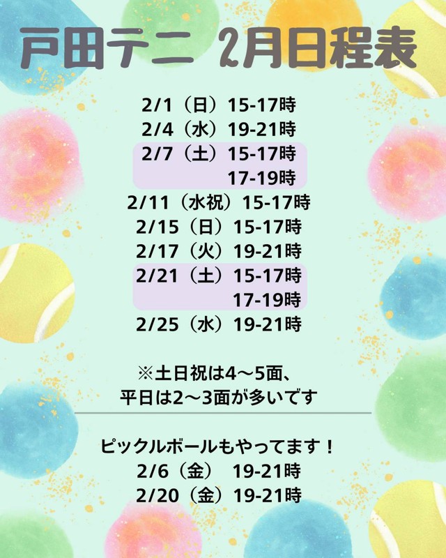 | 連絡事項や アピールポイント | ◤◢◤◢◤◢◤◢◤◢◤◢◤◢◤◢ 活動日程は画像に載せていますので、ご確認ください(*^▽^*) インスタ、LINEからの応募も受付中です👍 以下応募テンプレートを添えて連絡をお願いします(*^^)v ①お名前、性別 ②年齢(募集対象:18〜35歳) ③お住まい(ざっくりで大丈夫です) ④経験の有無(例:高校3年間、ブランク5年) ▼インスタ https://www.instagram.com/todatennis/ ▼代表者LINE(ID:smb400、表示名:あきのり) https://line.me/ti/p/liNEJ2kk81 ◤◢◤◢◤◢◤◢◤◢◤◢◤◢◤◢ ◾️サークル概要 ━━━━━━━━ ★戸田テニは「社会人になっても学生時代のような楽しく集まれる場が欲しい!」をテーマに2022年12月に設立した社会人硬式テニスサークルです (*^▽^*) ★練習だけでなく、飲み会をはじめとした交流イベントも定期的に開催しています👍 ★最近ピックルボールも始めました!ピックルは体育館で行うため、天候に関係なく参加可能です(^^)v 【向いている方】 〇楽しみながら運動習慣を作りたい方 〇競技を通して友達作りをしたい方 【向いていない方】 ✖黙々と競技だけ行えれば良いという方 ✖勝ちにこだわる等、競技志向が強すぎる方 ★アクティブメンバー数 男性:約70名 女性:約30名 ★一回あたりの参加人数 20名程度(日程やコート数により前後します) ★年代 20代6割、30代4割くらい ★男女比 男性7:女性3くらい ⇒他団体に比べると女性の参加も多いようなので、女性も参加しやすい環境になっているかと思います(^^)v ◾️開催場所 ━━━━━━━━ 戸田市スポーツセンター ⇒JR埼京線 戸田駅から徒歩7分、駐車場無料、更衣室&シャワー完備 蕨市民体育館(ピックルボール開催場所) ⇒JR京浜東北線 蕨駅から徒歩12分、駐車場有料、更衣室&シャワー完備 ◾️活動日程 ━━━━━━━━━━━━━━━━ サークル画像に載せていますのでご確認ください👍 ◾️練習について ━━━━━━━━ 当サークルでは以下3種類の練習を開催しています。 🔰初級ゆる練(対象レベル:初心者~初中級) ◎前半は球出し練習とラリー練習を交互に行い、後半はルール緩めのダブルスを行います ◎女性は初心者レベル(上位者とであれば簡単なラリーができる)から、男性は初中級(硬式経験あり、ラリーがある程度続く)からの参加を受け付けています ▼初級ゆる練参加者の例 ・軟式テニスはやったことがあるが、硬式は初めて ・最近スクールに通い始めて練習機会を増やしたい ・硬式テニス経験者だがブランクが長すぎて不安 ※完全未経験だと難しいですm(__)m ★ラケットレンタル無料! ラケットはたくさん用意していますので、ラケットの準備が間に合わない方も参加できます👍 🎾基礎練(対象レベル:初級~中級) ・1面最大定員8名 ・ラリー練の時間を長くとるため、練習中心で参加されたい方におすすめです! ・女性は初級(テニスベアLv.3)から、男性は初中級(テニスベアLv.4)からの参加を受け付けていますm(__)m ・ブランク長めの方も歓迎です👍 🔥ゲーム練(対象レベル:中級~上級) ・1面最大定員6名 ・ゲームの時間を長くとるため、ゲーム中心で参加されたい方におすすめです! ・女性は初中級(テニスベアLv.4)から、男性は中級(テニスベアLv.5)からの参加を受け付けていますm(__)m ◾️参加費 ━━━━━━━━ ◎入会金や月会費等はなく、練習毎の都度参加費制です ◎参加費には施設利用費、ボール代等すべて含まれています! 🎾基礎練、初級練🔰 初回:1,000円 2回目以降:800円 🔥ゲーム練 初回:1,200円 2回目以降:1000円 🟡ピックルボール 一律500円(ラケットレンタル代込) ※参加費は原則PayPay支払いをお願いしています ※初回のみ現金でもOKです ※2回目以降はPayPay支払いにより200円引きとなります ◎ラケットレンタル無料! ラケットは無料で貸し出し可能です! ラケットの準備が間に合わない方は事前にご相談ください(^^)v ◾️応募の流れ ━━━━━━━ 1️⃣ 以下応募テンプレートを添えてメッセージ送信 ①お名前、性別 ②年齢(募集対象:18〜35歳) ③お住まい(ざっくりで大丈夫です) ④経験の有無(例:高校3年間、ブランク5年) 以下アカウントへ直接連絡でもOKです👍 ▼インスタ https://www.instagram.com/todatennis/ ▼代表者LINE(ID:smb400、表示名:あきのり) https://line.me/ti/p/liNEJ2kk81 2️⃣ 出欠用のLINEグループ(オープンチャット)に招待 3️⃣ LINEグループにて出欠回答 ◎連絡は即日でお返ししていますので、随時ご応募お待ちしています(*^▽^*) ◎当日の応募も歓迎です!連絡を見逃してしまう可能性もあるので、開始1時間前くらいまでにご応募ください<(_ _)> ◾️禁止事項、注意点 ━━━━━━━━━━ ✖ネットワークビジネス、セールス、宗教、他サークル引き抜き等、勧誘行為全般 ✖初回から異性の連絡先を聞くなど、明らかにナンパ目的での参加と判断される行動 ✖上記に限らず当サークルに不向きと判断した場合、以降の参加をお断りさせて頂く場合もありますので予めご了承ください ⚠️時期によって募集制限を行っています ※