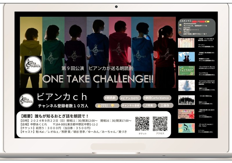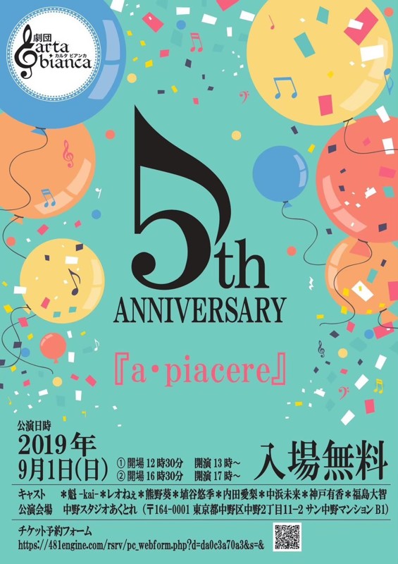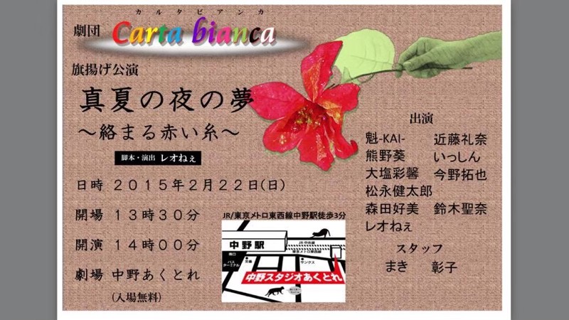 | 連絡事項や アピールポイント | 今年の秋に公演を目指しております!! 出演者を募集しています!! 埼玉のミュージカル劇団・・・劇団Cartabiancaと申します!! 「Cartabianca」は「カルタビアンカ」と読みます。 Cartabiancaとは、イタリア語で「白紙」という意味です。 舞台製作は、必ず白紙の状態から始まります まっさらな白紙に、自分の個性という色を塗りつけてみませんか? 仲間たちの個性と混ざって、カラフルな舞台を作りましょう! お芝居をやってみたい!お芝居だけじゃなく歌やダンスもやりたい! ・・・でも、得意じゃないから、ダメなんだろな・・・ とんでもございません!! 団長も、歌やダンスは不得意(笑) しかし、仲間達と切磋琢磨し、楽しい舞台を作っています! 初心者の方、興味のある方、大歓迎です!! 演技やダンス、歌だけでなく ・舞台監督 ・脚本 ・作曲 ・振り付け ・衣装担当 など裏方希望の方も募集中です! 夢や目標はでっかく・・・いつか劇場ホールで公演を目指しています。 ◆劇団費・毎月5,000円 ◆いつでも見学可能 ◆チケットノルマ無し お気軽に見学も出来ます ご連絡お待ちしております!! 12月21日に稽古見学出来ます。 X(旧Twitter)@Carta_bianca042 |