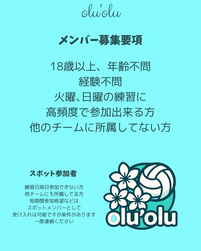 連絡事項や アピールポイント | 土浦市にて活動してる 男女混合バレーサークル olu'olu(オルオル)です🏐 今のメンバーは10代〜40代の男女 未経験者、ビギナー者、上級者と色々な方々です👫🏻 2024/11〜スタートし トータルメンバーは30人になりました 【活動】 日曜/火曜 19-21時半 土浦市藤沢小 土浦市都和南小 【募集してるメンバー】 18歳以上の男女 他のチームに所属してない方 定期的、継続的に練習に来れる方 なるべく日曜、火曜参加できる方 初心者〜中級者ぐらいまで 常識的でありコミュニケーションとれる 経験者参加条件 ・未経験者にもレベルを合わせれる方 上記を満たさない方は スポットメンバーとして参加は可能ですが 条件がありますのでご連絡ください 気になってお問い合わせしてくださる際 ⚫️年齢 ⚫️バレー歴、運動歴の有無 ⚫️他チーム所属有無 ⚫️練習参加可能日(火曜、日曜両日orスポット メッセージに記入お願い致します |