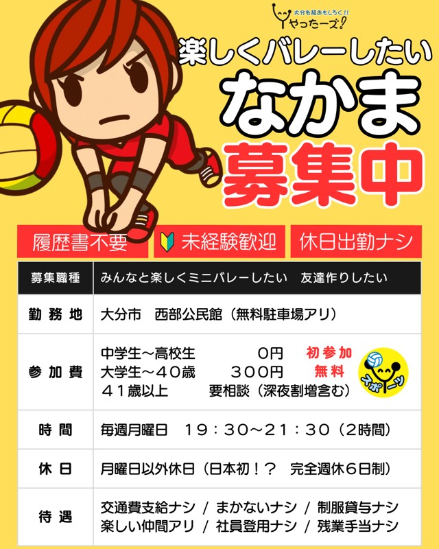 バレーボール大分大分のバレーボールチームです。現在、メンバーを募集しています。募集しているのは初心者用のチームなのでルールや内容を超ゆるくしています。バレーボールに興味がある方は、ぜひご応募ください。| 募集の状態 | 募集中 |