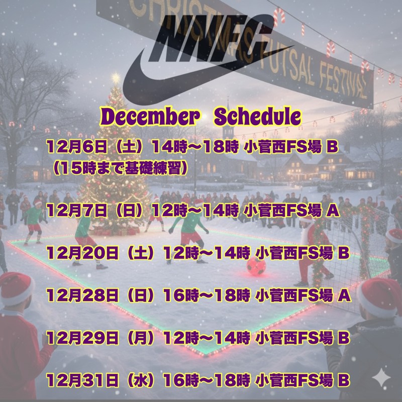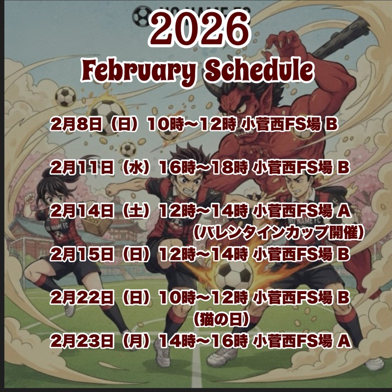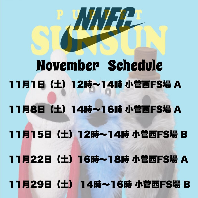 | 連絡事項や アピールポイント | 《チームについて》 NO NAME FC(ノーネームエフシー)は、チームとは言っていますが、個サルの集まりのような感じで決まったメンバーがいるわけではなく、スケジュールのあったメンバーが参加して練習や試合をして活動しております。 ほぼ毎週、土曜日、日曜日、祝日に行っています。 《参加について》 当チームは年齢や性別、経験等も問わずどなたでも参加できます。 子供の頃や学生時代に、休み時間や放課後に友達と遊んだ様に仲良く楽しく難しい事や固い事は無しでプレーしております。 基本的なルールは守りながら、メンバー同士がお互いを思いやり、何かあった時は声を掛け合い、助け合いプレーしています。 ガチではないので、強シュートや接触プレーは禁止にしております。 ミックスですので、女性やメンバーのお子様が参加することもあります。 出来るだけ怪我の無いよう日々気を付けております。 参加費は1回300円になります。お父様やご家族で参加の場合は中学生以下は無料になります! お友達と一緒に、ご家族で、カップルでの参加も大歓迎です! 気になる事やご質問はお気軽にメッセージ下さい! 皆さんの参加お待ちしております(^^) ★今後のスケジュール★ ⭐︎⭐︎⭐︎画像をご覧下さい⭐︎⭐︎⭐︎ |
