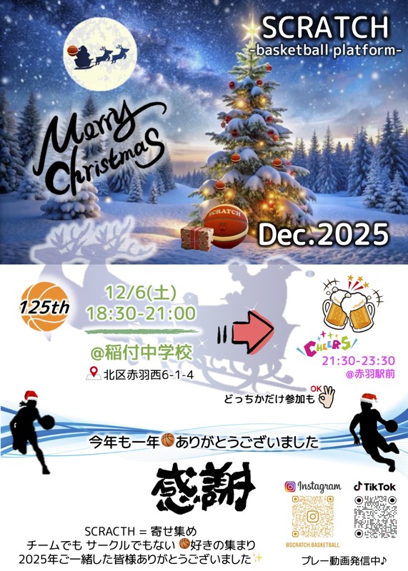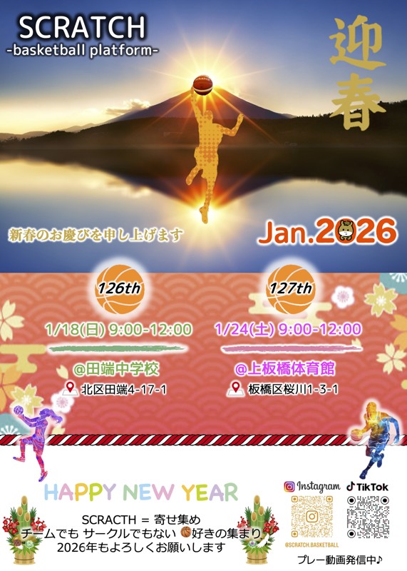 | 連絡事項や アピールポイント | SCRATCH=寄せ集め その名の通り、あえてメンバーを固定せず、 初参加の方が輪に入りやすい空間づくりを意識してます♪ フランクに、いきなりあだ名で呼んだりさせていただきます! 【流れ】 〜30分:各自で自己紹介し合ったり、準備、シューティングなど 30分後〜:全体でレイアップなどアップ その後〜:ひたすらゲーム(だいたい3チーム(男性3 女性2)) 始まる前に集合して、 初参加の方を紹介するあのあまり意味のない時間はありません笑 集合写真を撮る風潮も基本ありません笑 終わった後は、各自解散となります。 気の合う人いたら、ご飯などご自由にどうぞー 【動画撮影】 体育館側の撮影許可いただける場合、 インスタ用にプレー動画を撮影しています。 「事務所NGです笑」という方は仰ってください。 【雰囲気】 女性や初心者の方、バスケ経験浅い方に優しいプレーを徹底的に推奨してます! 男性で個人技ばっかりだったり、パワープレーで怪我のリスクを感じる方、外からバンバン3P打つ方は、その後声掛けしません。 チームプレー、パスワークをとにかく重視してます!! 【Instagram】 SCRATCHで検索ください。 日程やプレー動画アップしてますので、雰囲気伝わるかと思います♪ 【参加費】 無料ですのでお気軽に♪ (500円とか小銭を集める風景が絵的に価値観に反するため。) その分、声出して雰囲気作っていただいたり、得点板やってくれたりいただけますと幸いです! 何かご不明な点があれば、お気軽にご連絡いただけたらと思います! |