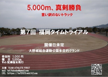 | 連絡事項や アピールポイント | 新型コロナウイルス感染拡大の影響で全国各地で開催中止が相次いでいたマラソン大会も開催されるようになりました。 開催されるようにはなりましたがコロナ前とは違い参加料の値上げなど出場するにはハードルが高くなったのも事実です。 定員割れの大会やエントリーを開始したもののランナーの集まりが悪くエントリー期間途中での大会の開催中止を決定する大会なども出てきています。 そこで少しでもランナーが出場しやすい大会を作ろうと「TEAM ATHLTE FIRST」と言う組織を設立して昨年より大会を開催するようになりました。 組織名の通り「選手第一」の考えで営利目的ではなく経費を差し引いた収益は全額寄付をすると言うチャリティー大会での開催をいたします。 小さな組織ですので大きな大会は開催できず小規模な大会となりますが「選手第一」、「選手が主役」、「ランナーは仲間」の気持ちを持って大会を開催いたします。 私たちと一緒に大会を作って行ってくれる方を募集中です。 例年11月に開催される「福岡マラソン」は、福岡市と糸島市を結ぶ美しいコースで多くのランナーに親しまれています。しかし、現在のゴール地点にはいくつかの課題があると、多くの参加者や関係者から声が上がっています。 福岡マラソンゴール地点変更オンライン署名のサイトを立ち上げました。 https://voice.charity/events/6108 行動を起こしたことでブラックリストに載って来年以降、私が福岡マラソンに当選することはないと思いますがそれを覚悟でやります。 ランナーの力が頼りの活動です。 ご協力をお願いいたします。 【大会案内】 「第3回四王寺林道トレ」 【日 時 】4/25(土) 【集合場所】 大野城総合公園(まどかパーク) 【受 付】 7:00〜7:10 【コ ー ス 】 大城林道 【距 離】 約12km 【参 加 料】 無料 「第7回福岡タイムトライアル」 【日時】 5/16(土) 【会場】 大野城総合公園多目的グランド 【種目】 5,000m 5レース 【参加料】 1,000円 【備考】 ボランティアスタッフの方は参加料無料でレースに出場できます どちらともTEAM ATHLETE FIRSTのホームページかイーモシコムで詳細を確認されてください。 ご都合のよろしい方は是非参加されてください。 ホームページ http://taf2023.web.fc2.com |
