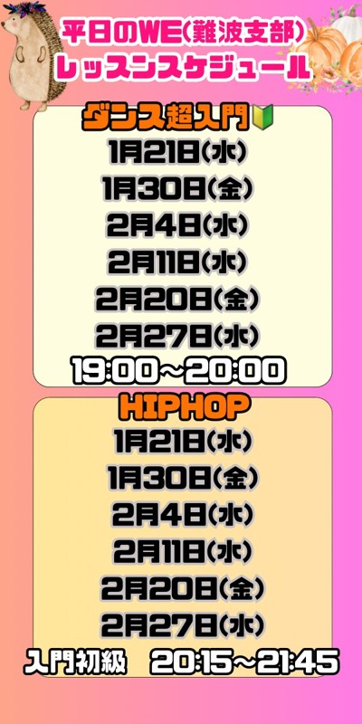 | 連絡事項や アピールポイント | 社会人ダンスサークルWEse(ウィーズ)です😊 【各月の活動日程表は画像をご参考ください】 【🆕5月のダンスイベントに出演します!メンバー募集してますので、質問でも何でもお申し付けくださいませ☺️】 難波、心斎橋で未経験や初心者の方向けに ダンスレッスンを開催しております。 最近では元々経験者で 昔ダンスをしていたがまた再開したいが 大手のスタジオに行くのはちょっと、、 という方も来られています! 活動に関しては平日の19時~、20時~からやっていますが、基本は受けたいレッスンだけを受けていただくスタイルです! 毎週やっていますが皆さんマイペースに参加しています😊 【こんな方はどうぞ!】 普通のスタジオだと行きにくい、 行ったけど難しかった(゚Д゚;) 運動音痴だけど不安だ(-_-;) リズム感、音感無いんだけど、、(´;ω;`) そういう方が楽しめるように丁寧に優しく レッスンを行っているのでこの機会を ものにしちゃって下さい😊 一つ一つ丁寧に指導させて頂きます! 基本的には誰でもウェルカムです✨😂 舞台に出たい方やイベントに出たい方は 専用にグループを組んでいます!(^^)! ダンスだけでなくレッスン後のトークや仲間作りを 楽しみに来られている方も沢山いますよ! ダンスを通じて日常に笑顔と刺激を提供できる 大人のコミュニティの場にしたいと思っています! ジャンルはHIPHOPです! 今後girl'sやJAZZを増設予定です😊 1レッスンは60分か90分で 入門か初級に分かれています。 60分レッスンは1500円です。 初回体験は1000円です。 90分レッスンは2000円です。 初回体験は1500円です。 超入門は50分一律500円です。 流れとしては 【自己紹介】→【ストレッチ】→ 【レッスン】→レッスン後【フリータイム】 となっております。 超入門はよりベーシックな体の使い方や 簡単な技とステップで汗をかいてダンスに馴染んでいく場にしております。 運動が苦手な方やリズム感覚に不安がある方でダンス未経験の方はぜひどうぞ! 入門は簡単なステップやリズム取りを何種類か教わり、組み合わせて簡単なルーティンを繰り返します。 運動経験があってもダンス未経験の方や基礎を見直したい方にピッタリ! レッスンは初級ということでスキルをお伝えして、 簡単な振り入れをして何度もルーティンを踊る流れです。 ダンス歴半年以上の方向けのしっかり踊るレッスンです。 ダンスした事ないけどやってみたい、 興味がある方は是非! 内容は初めての方〜初心者、経験者やブランクのある方も 楽しめる内容となっております。 ベーシックのステップ1つをメインにそこから 派生させてレッスンしていきますので安心して お越し下さいませ😊 次回は 【HIPHOP入門初級】 1/21 20:15~21:45 1/30 20:15〜21:45 2/4 20:15~21:45 2/11 20:15~21:45 2/20 20:15~21:45 2/27 20:15〜21:45 の時間帯で開催します☺️ レッスン料金は2000円です。 【ダンス超入門】 1/21 19:00〜20:00 1/30 19:00〜20:00 2/4 19:00〜20:00 2/11 19:00〜20:00 2/20 19:00〜20:00 2/27 19:00〜20:00 超入門は一律1000円です。 気になる方は何でもお気軽にご連絡下さい! お友達同士の参加も大歓迎です! 今来ているメンバーは女性も多く、 男女比も4:6です。 初級は7名以上が常に参加してます。 入門レッスンはだいたい少人数3~6名前後ですので 必ずフォローしますので安心してお越しください! 大人からダンスを始めた方ばかりの方が 9割と多いのでお気軽にお越し下さいませ😊 ダンスを通してみなさんと楽しい時間を過ごせる事を 楽しみにしております☺️ ※勧誘目的、ナンパ目的の方は禁止としています。 発見した場合は拳骨です。 |